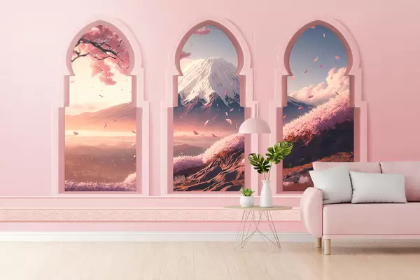 Τοιχογραφίες Μεγάλα παράθυρα ανατολίτικου στιλ με εκπληκτική θέα στο όρος Fuji σε απαλό ροδακινί χρώμα Nr. w08082