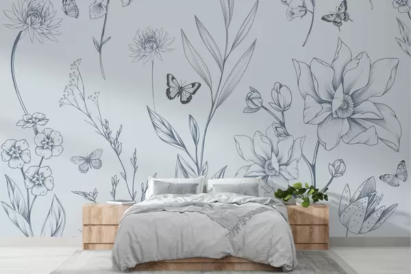 Τοιχογραφίες Boho μονόχρωμα λουλούδια και πεταλούδες σε μπλε χρώμα Nr. w08088v2