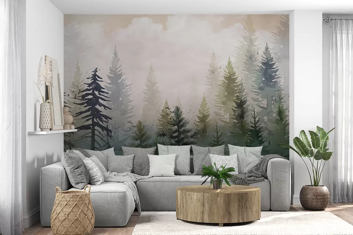 Τοιχογραφίες Δάσος από ψηλά αειθαλή πεύκα σε ένα ομιχλώδες περιβάλλον και γεμάτο μαλακό, μουντό τοπίο με σύννεφα Nr. w08160