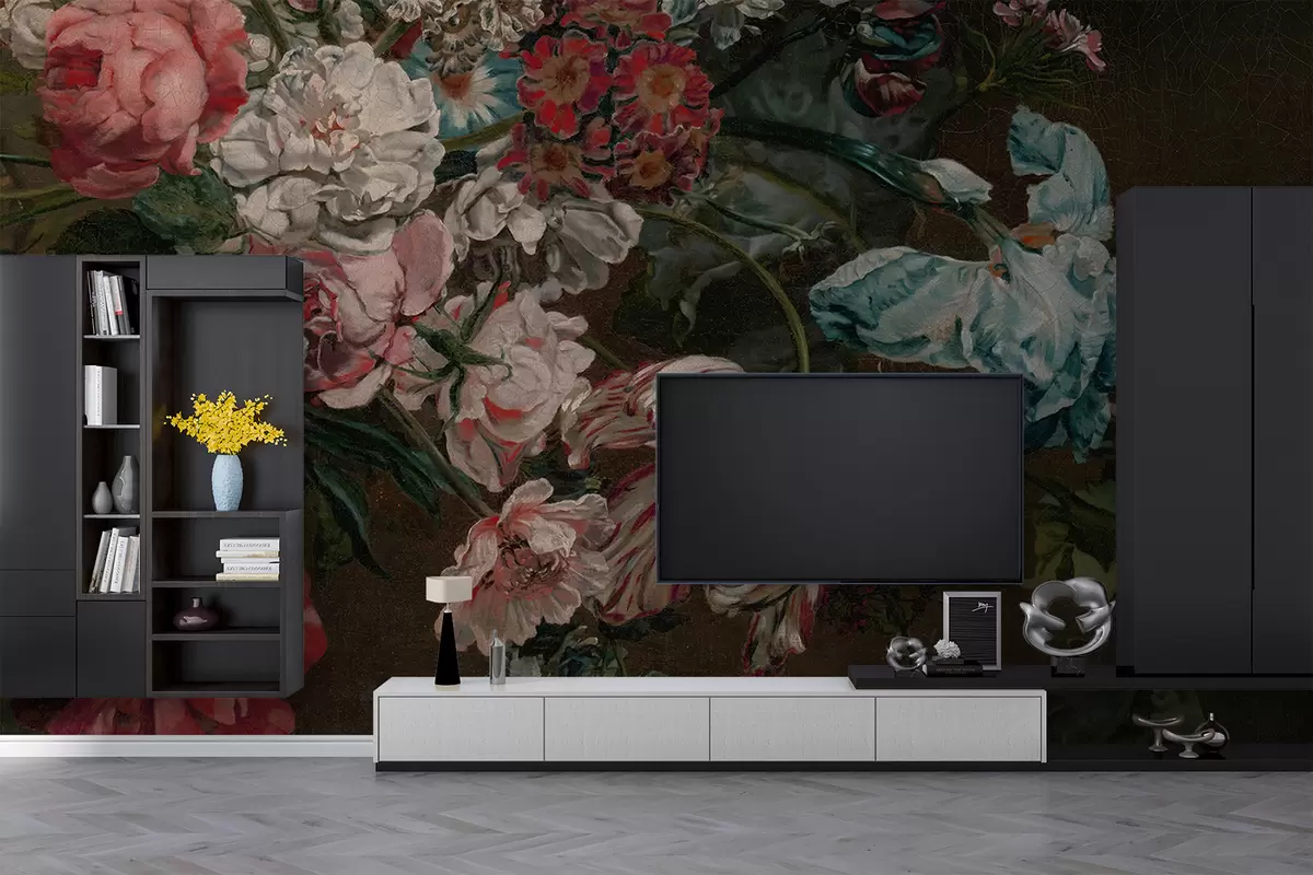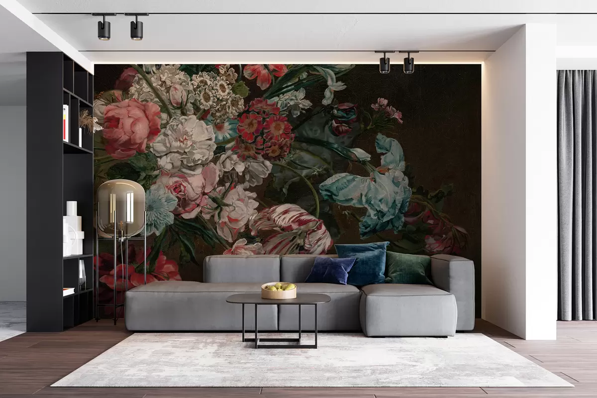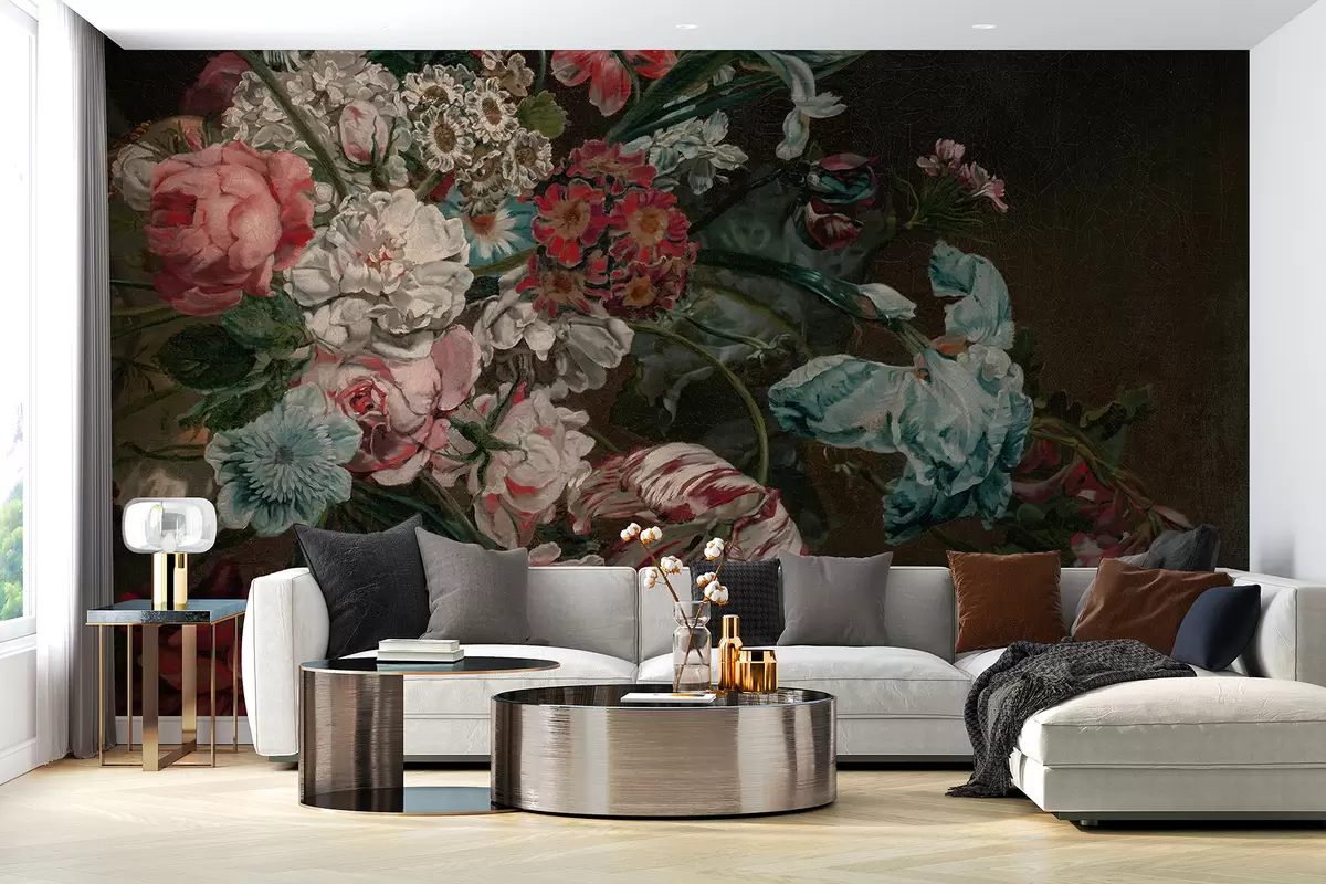 Τοιχογραφίες Vintage πολύχρωμα λουλούδια που περιλαμβάνουν ροζ παιώνιες, κόκκινα γαρίφαλα και λευκούς κρίνους σε σκούρο φόντο Nr. w08163