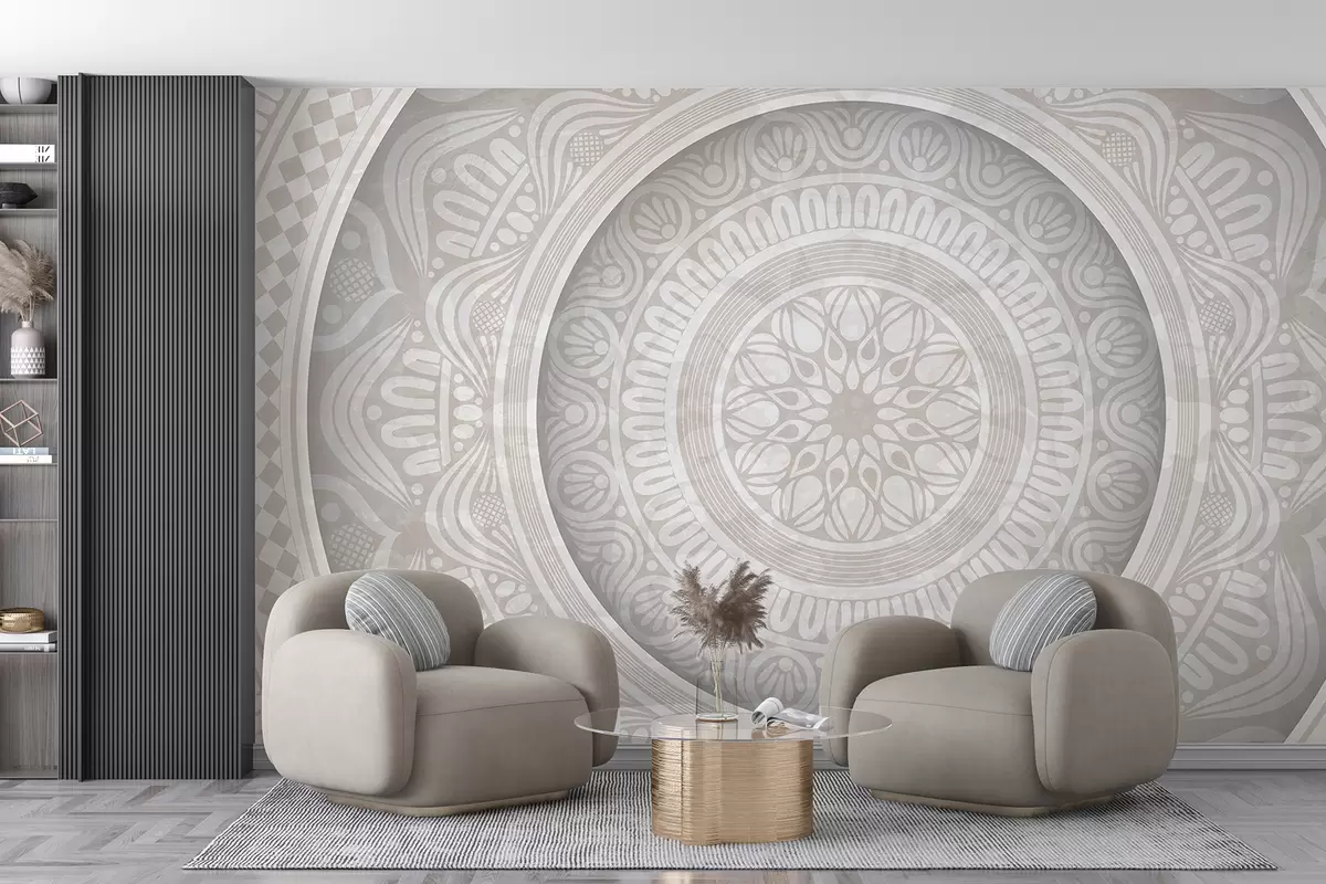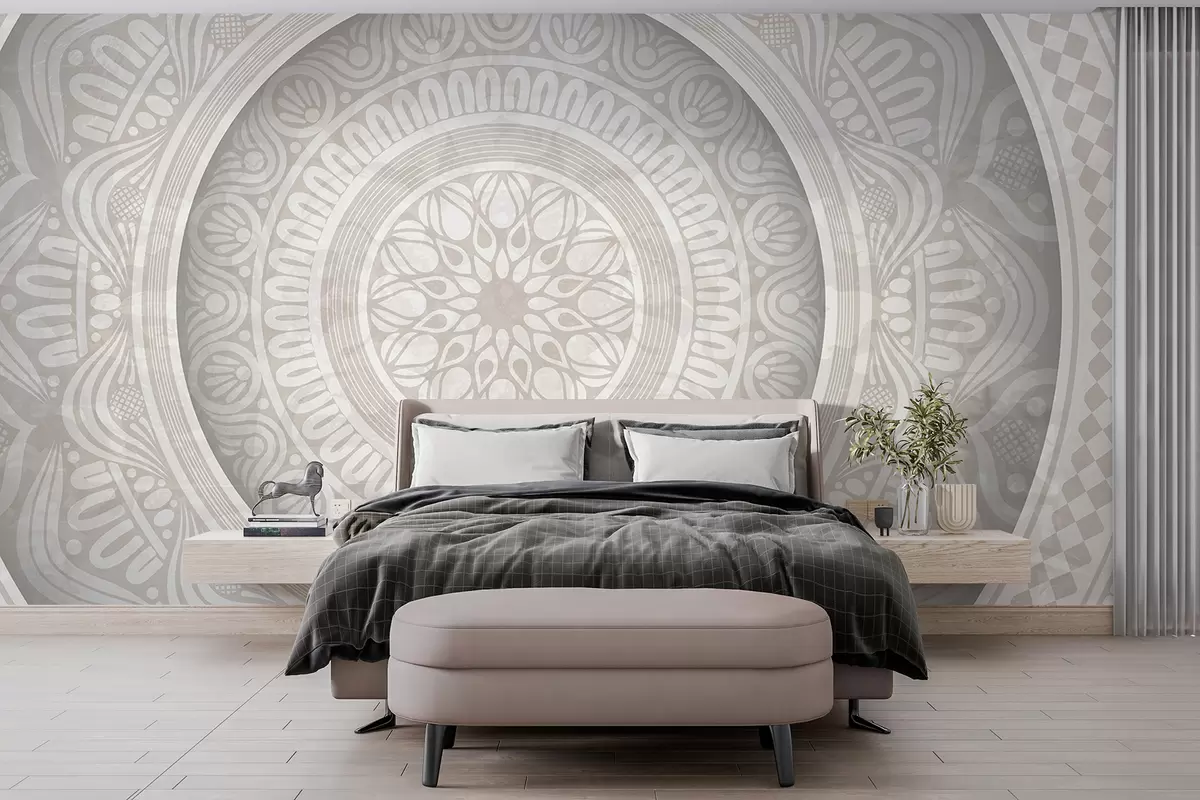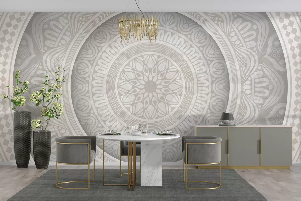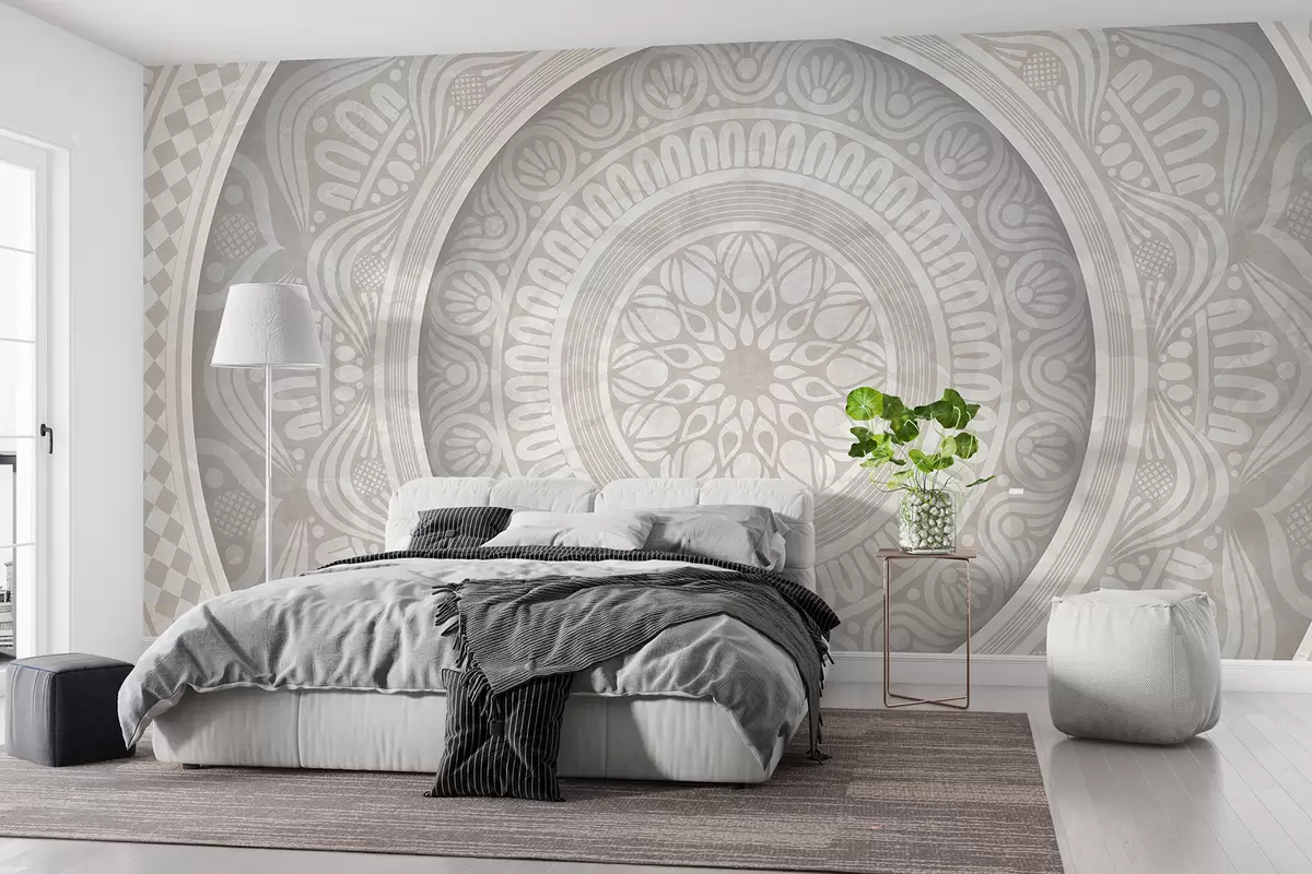 Τοιχογραφίες Μια λεπτομερής συμμετρική γκρι και λευκή στάμπα μάνταλα με ομόκεντρους κύκλους και γεωμετρικά σχήματα Nr. w08182
