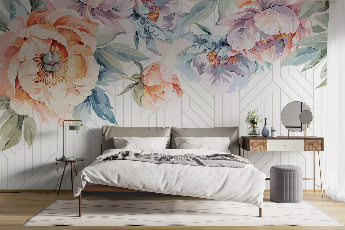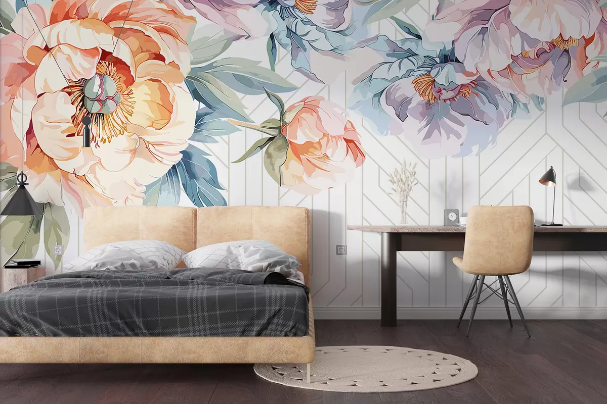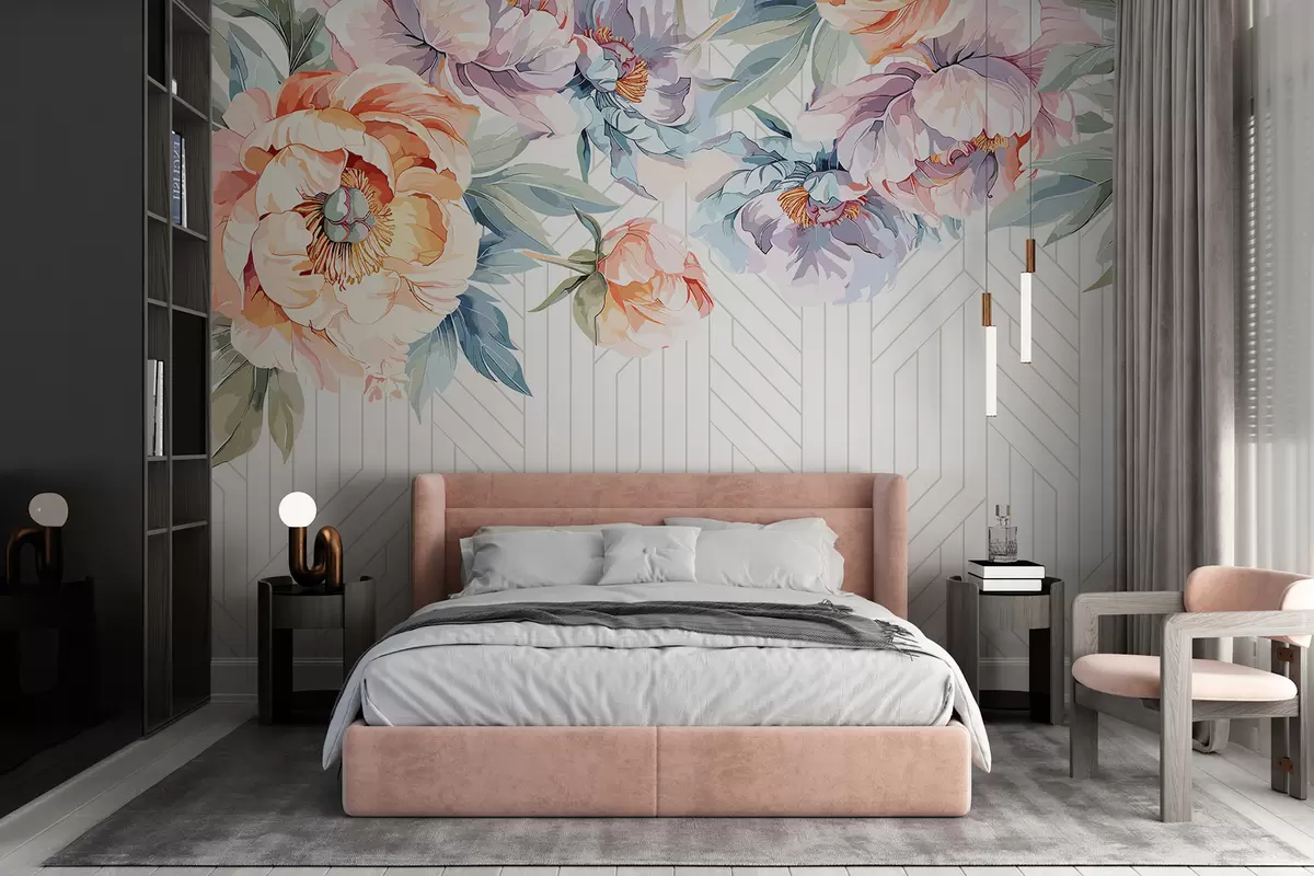 Τοιχογραφίες Ζωντανές ροδακινί και ροζ αφηρημένες παιώνιες με πράσινα φύλλα σε φόντο λευκό και γκρι μοτίβο Nr. w08183