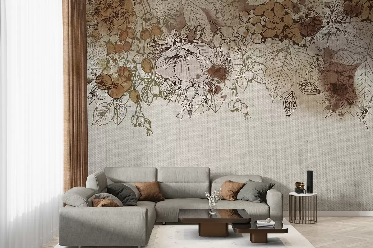 Τοιχογραφίες Φθινοπωρινά φύλλα και άλλα φυσικά στοιχεία διατεταγμένα σε διακοσμητική εκτύπωση σε φόντο με υφή Nr. w08190