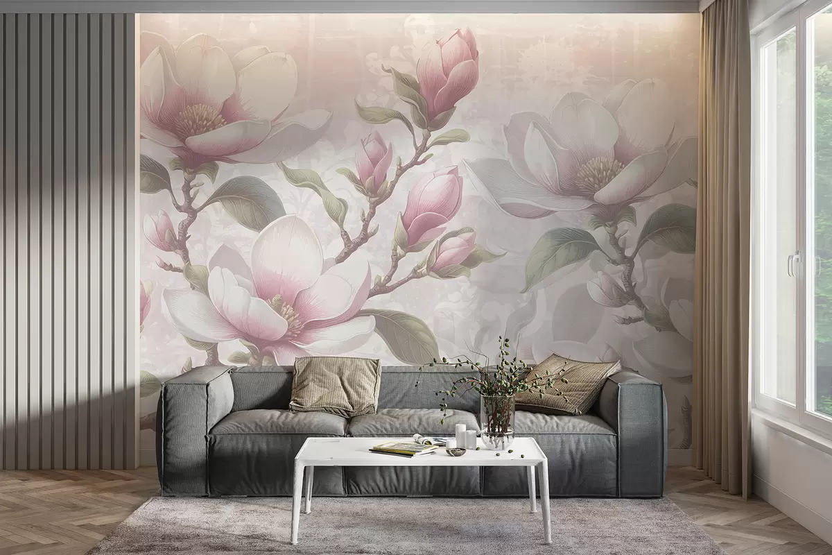 Τοιχογραφίες Λεπτά ροζ λουλούδια μανόλιας σε πλήρη άνθηση σε ένα απαλό, θολό φόντο Nr. w08216