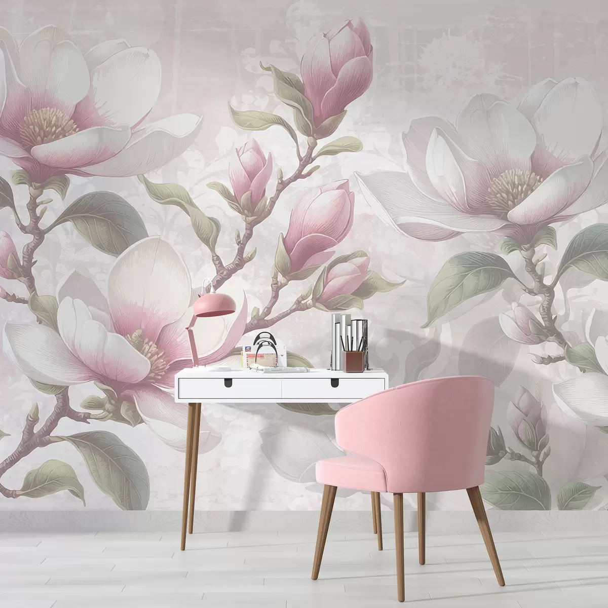 Τοιχογραφίες Λεπτά ροζ λουλούδια μανόλιας σε πλήρη άνθηση σε ένα απαλό, θολό φόντο Nr. w08216