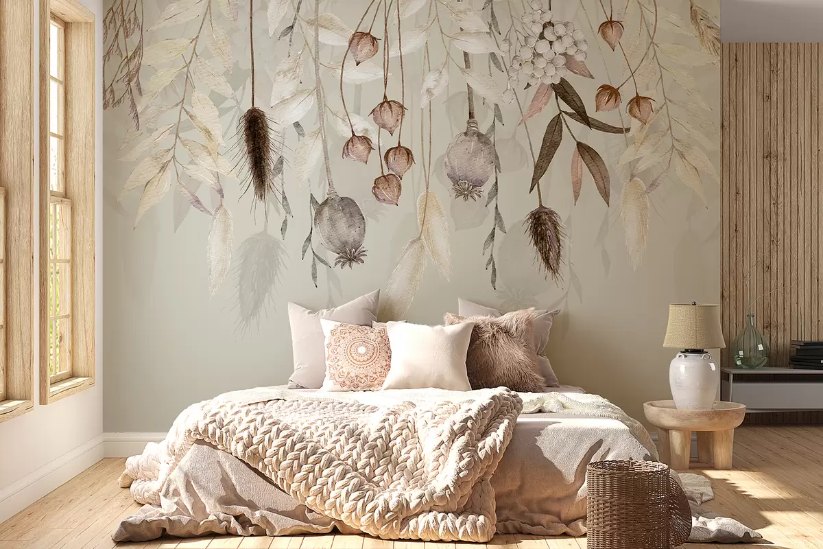 Τοιχογραφίες Λεπτή σύνθεση λουλουδιών με αποξηραμένα λουλούδια, φύλλα και φτερά που κρέμονται σε απαλό φόντο Nr. w08230