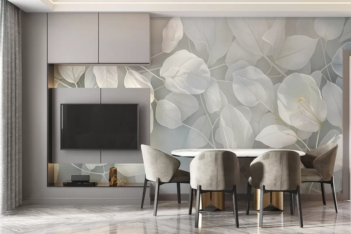 Τοιχογραφίες Απαλά, λεπτά λευκά λουλούδια με γκριζοπράσινα φύλλα σε θολό φόντο, δημιουργώντας γαλήνια ατμόσφαιρα Nr. w08232