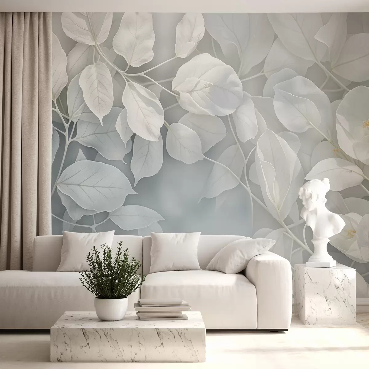 Τοιχογραφίες Απαλά, λεπτά λευκά λουλούδια με γκριζοπράσινα φύλλα σε θολό φόντο, δημιουργώντας γαλήνια ατμόσφαιρα Nr. w08232