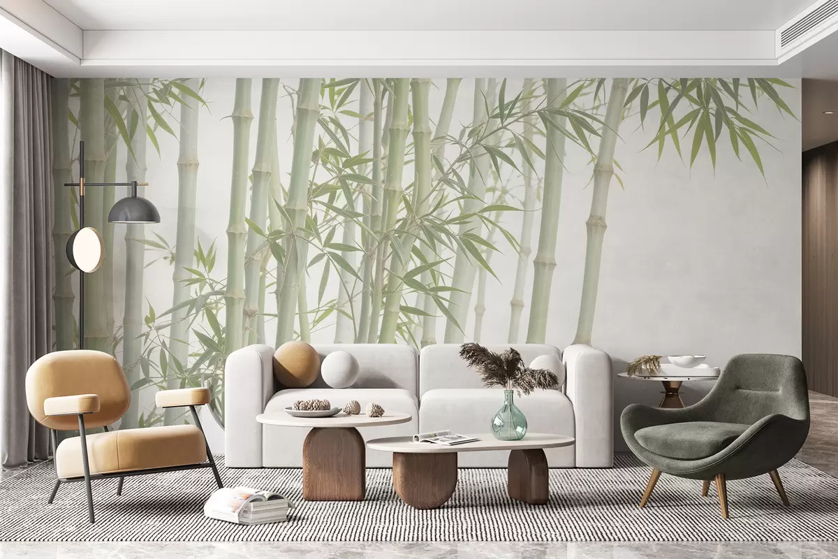 Τοιχογραφίες Ένα πυκνό δάσος μπαμπού με ψηλούς μίσχους μπαμπού και πράσινα φύλλα σε ένα απαλό, μουντό φόντο Nr. w08237