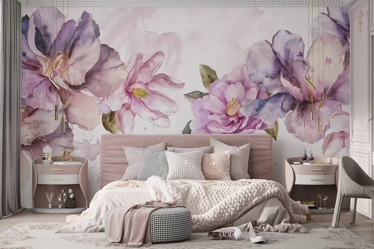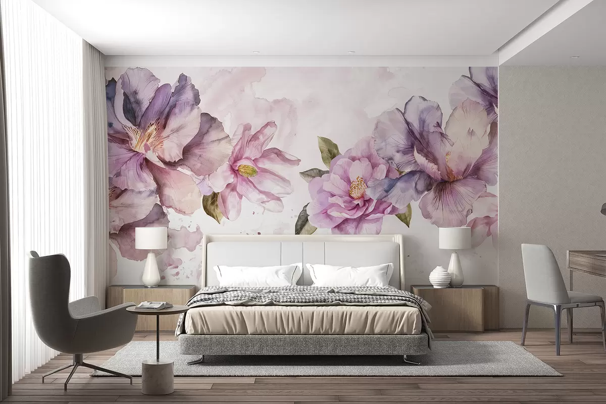 Τοιχογραφίες Λεπτά ροζ και μωβ λουλούδια ακουαρέλας με απαλά πέταλα και πράσινα φύλλα σε ανοιχτόχρωμο φόντο Nr. w08238