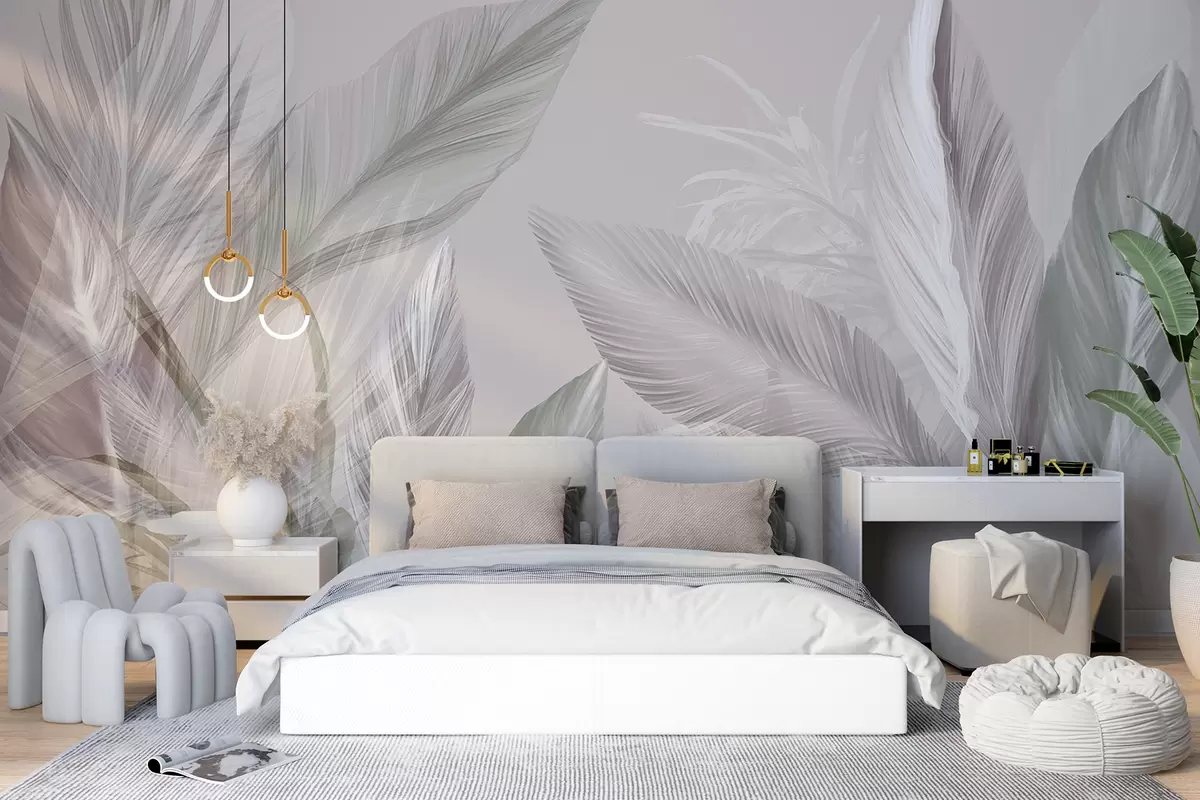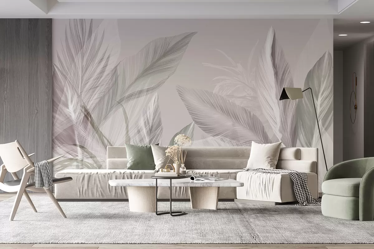 Τοιχογραφίες Απαλά λευκά, ροζ και γκρι φτερά και τροπικά φύλλα που επιπλέουν σε ανοιχτόχρωμο φόντο Nr. w08241v1