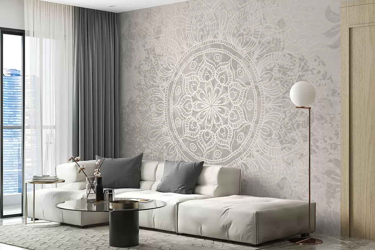 Τοιχογραφίες Ένα λεπτομερές λευκό μοτίβο μάνταλα σε ανοιχτό γκρι ανάγλυφο vintage φόντο Nr. w08246