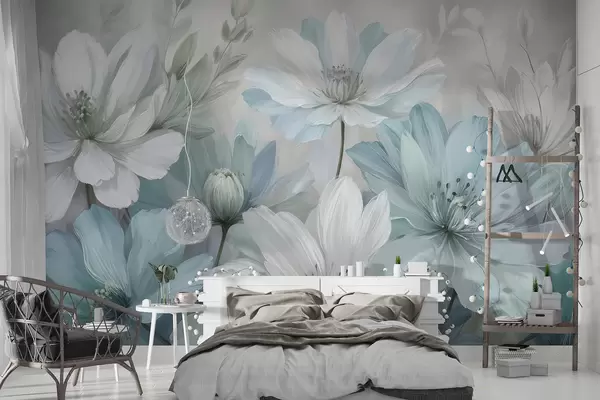 Τοιχογραφίες Μια κινηματογράφηση σε πρώτο πλάνο με λευκά και γαλάζια λουλούδια που μοιάζουν με μαργαρίτα ζωγραφική με απαλό, θολό φόντο Nr. w08247