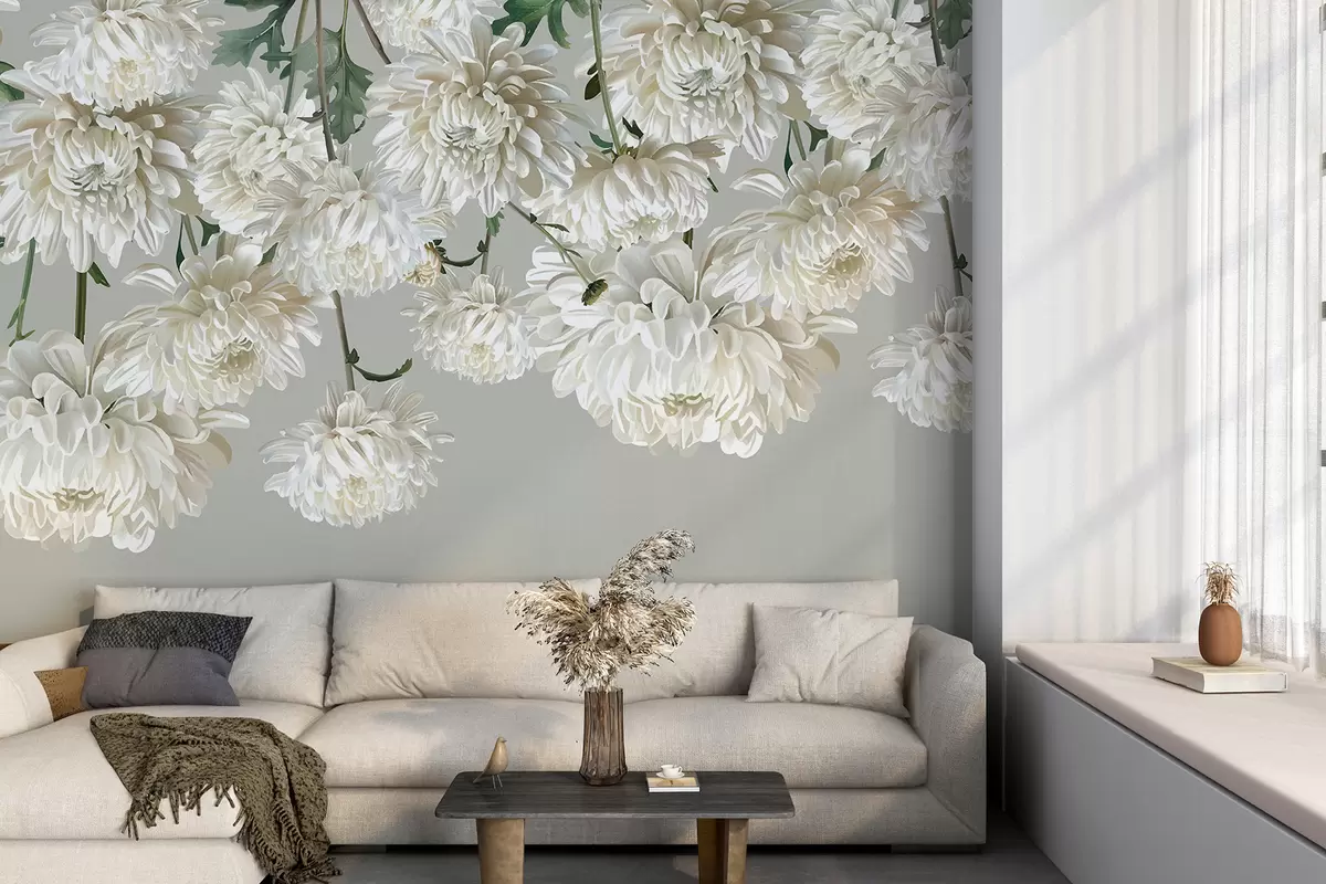 Τοιχογραφίες Λευκά λουλούδια χρυσάνθεμο με πράσινα φύλλα σε ανοιχτό γκρι φόντο Nr. w08251