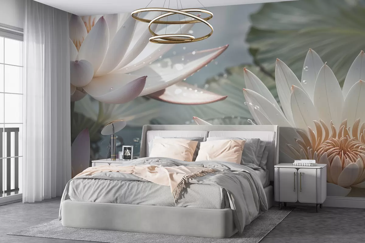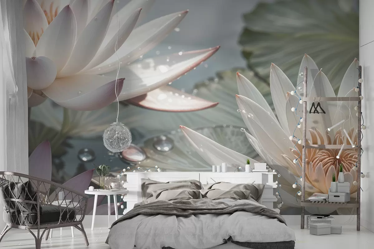 Τοιχογραφίες Κοντινό πλάνο λευκών λουλουδιών λωτού με σταγόνες νερού στα πέταλά τους σε θολό πράσινο φόντο Nr. w08252