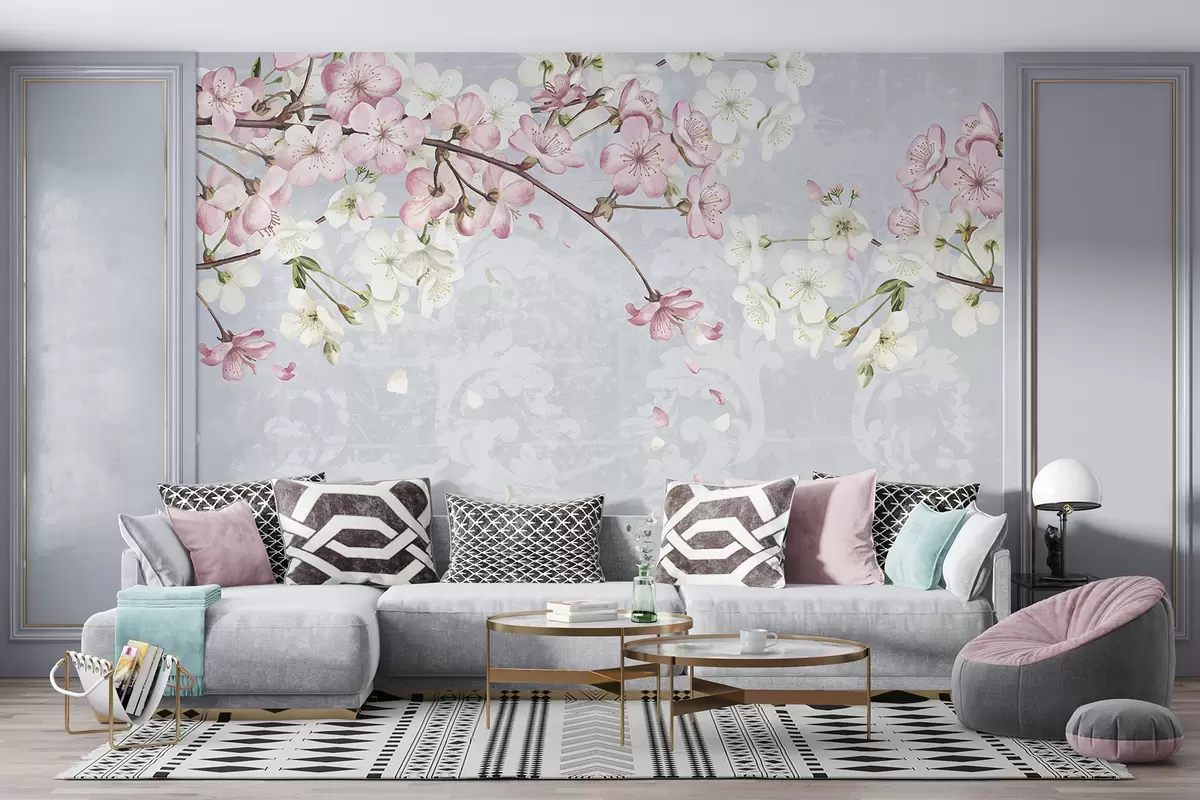 Τοιχογραφίες Ροζ και λευκά άνθη κερασιάς σε πλήρη άνθιση, με απαλά πέταλα που πέφτουν σε μπλε φόντο με υφή Nr. w08254