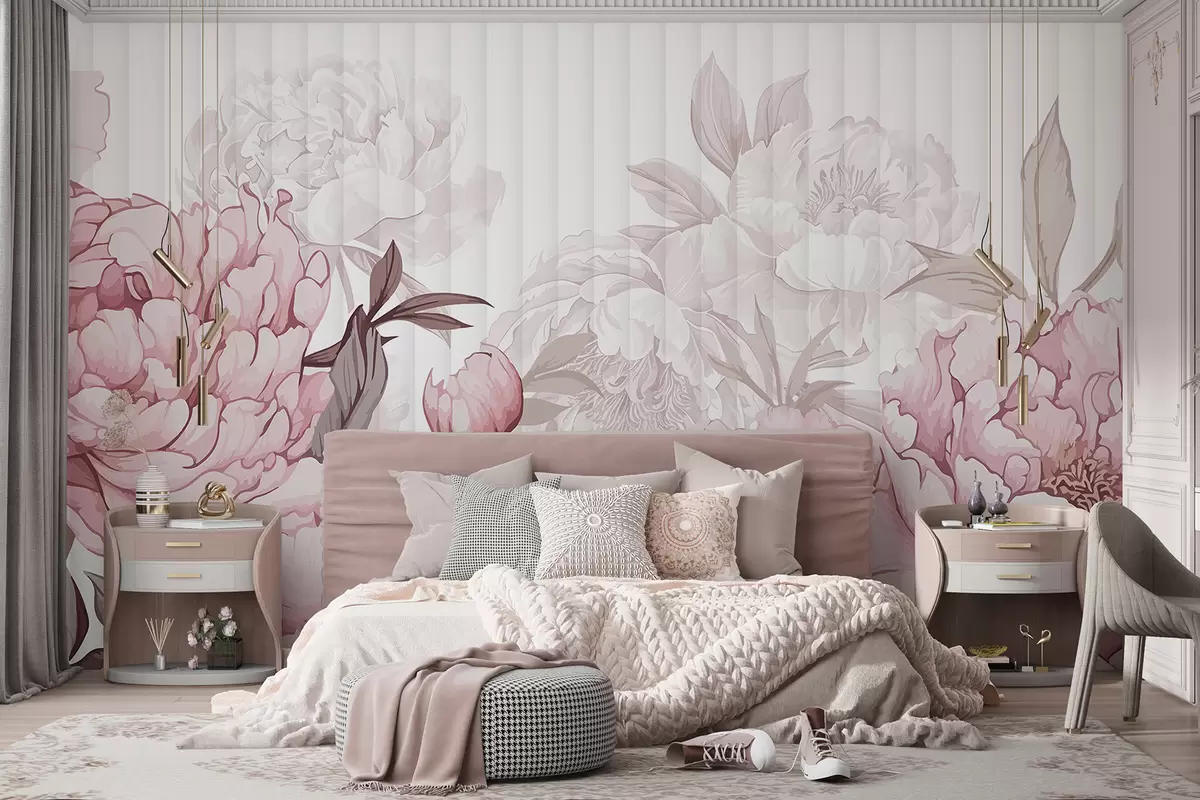 Τοιχογραφίες Κοντινή άποψη μεγάλων, λεπτεπίλεπτων ροζ και λευκών λουλουδιών παιώνιας σε ένα απαλό, με υφή φόντο Nr. w08255