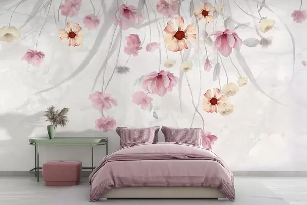 Τοιχογραφίες Λεπτά παστέλ ροζ και κίτρινα λουλούδια με κίτρινα κέντρα που πέφτουν σε ένα απαλό, θολό φόντο Nr. w08261v1