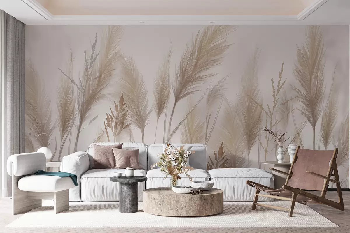 Τοιχογραφίες Ψηλά μπεζ φύλλα χόρτου που λικνίζονται από τον άνεμο σε ένα απαλό, φωτεινό φόντο Nr. w08268