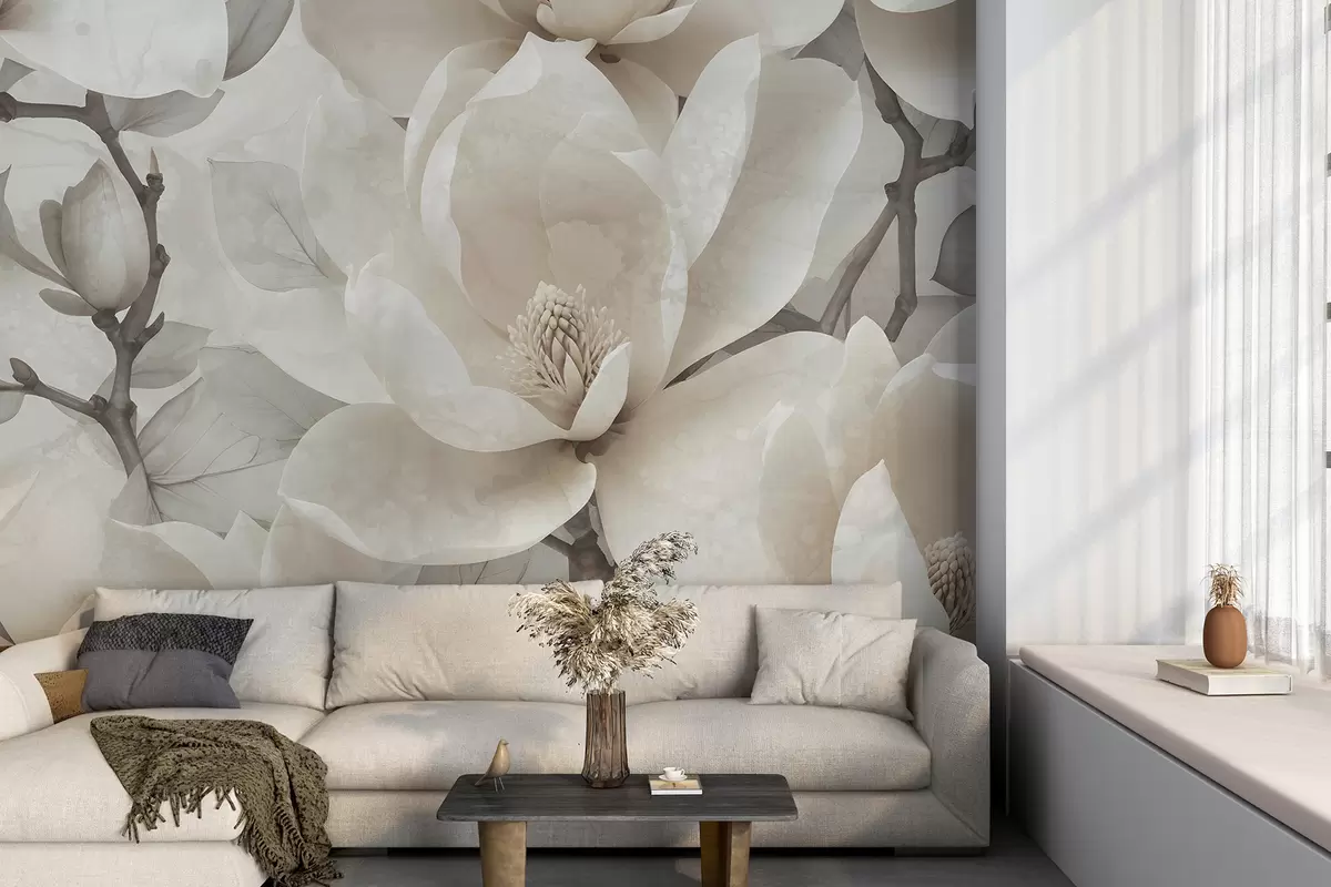 Τοιχογραφίες Λευκά άνθη μανόλιας σε πλήρη άνθηση, με απαλά, ευαίσθητα πέταλα και φυσικό φόντο με υφή Nr. w08278