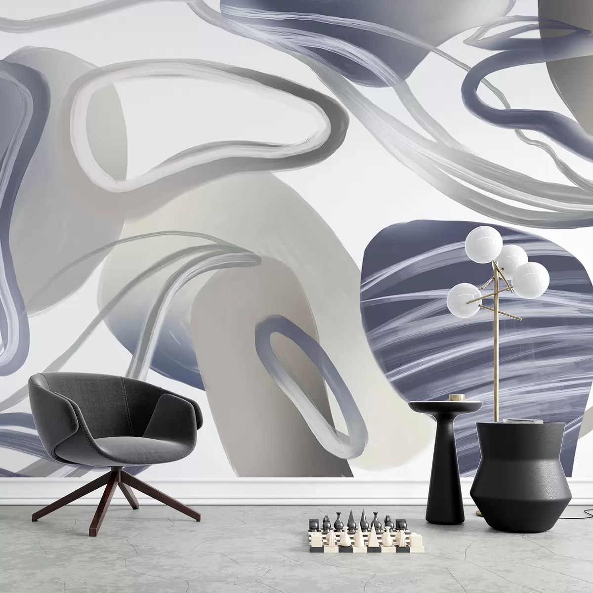 Τοιχογραφίες Αφηρημένα στροβιλιζόμενα σχήματα και καμπύλες σε αποχρώσεις του σκούρου μπλε που δημιουργούν μια δυναμική και ρέουσα σύνθεση Nr. w08279v1