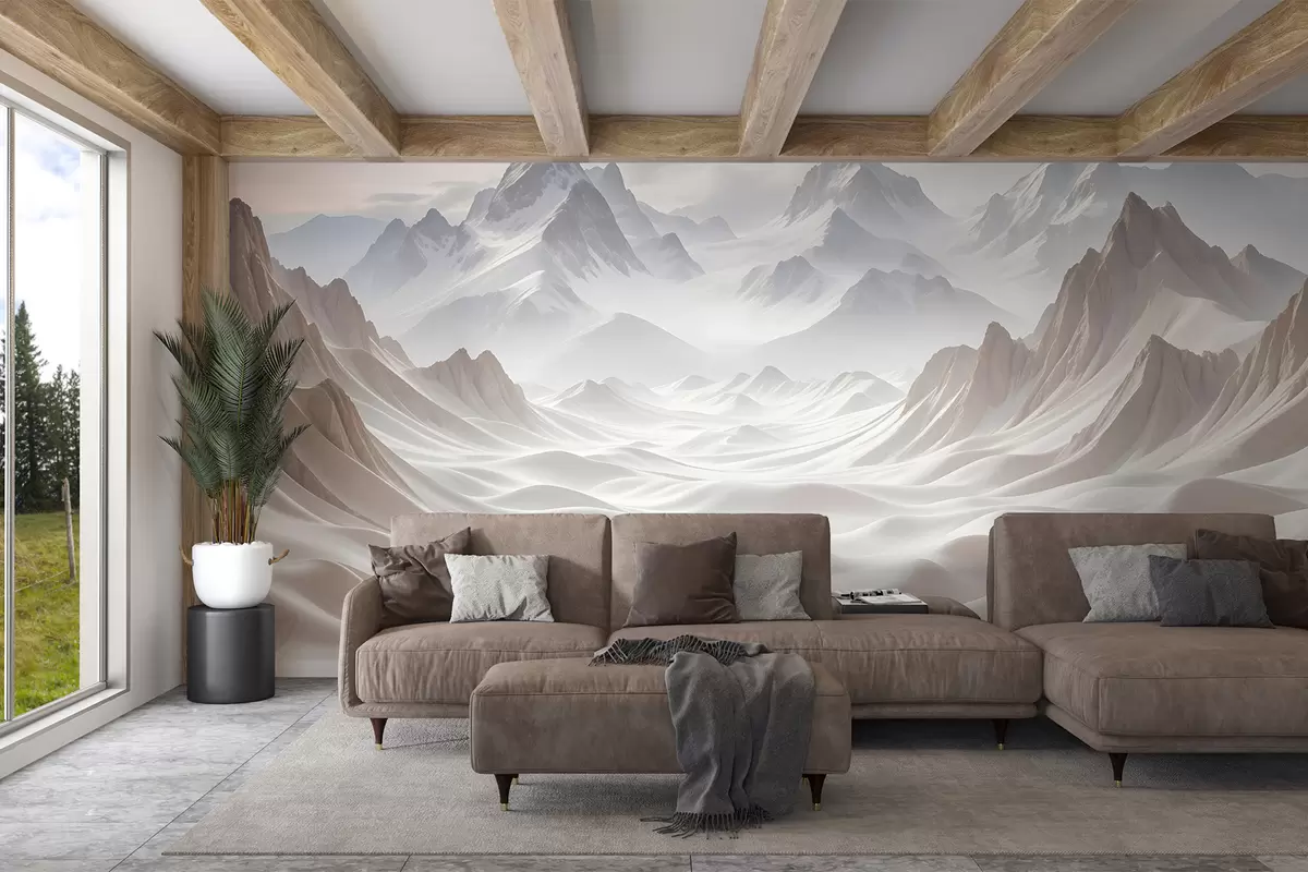 Τοιχογραφίες Χιονισμένες βουνοκορφές που αναδύονται από ένα ομιχλώδες, αιθέριο τοπίο με κυλιόμενους λόφους και κοιλάδες Nr. w08313