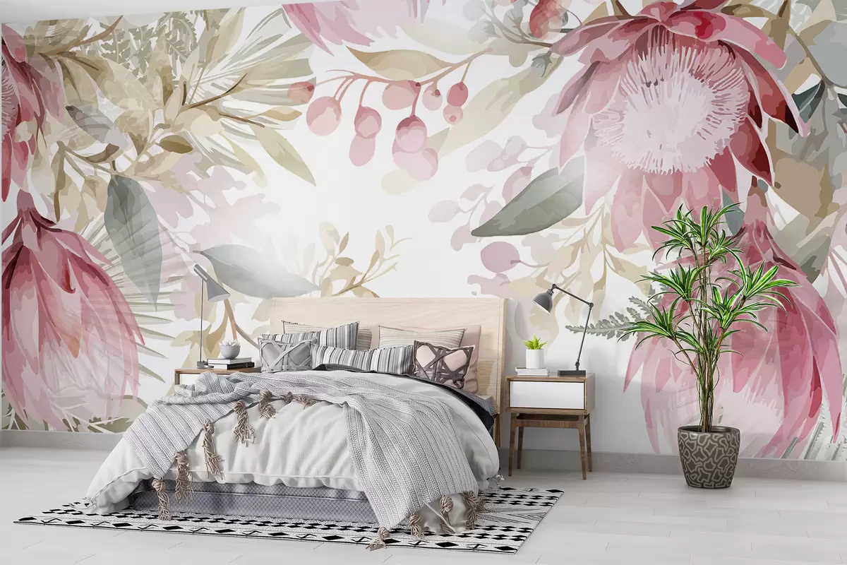 Τοιχογραφίες Μεγάλες ροζ και λευκές διαφανείς πρωτεΐνες με πλούσια πράσινα φύλλα σε ανοιχτόχρωμο φόντο Nr. w08315