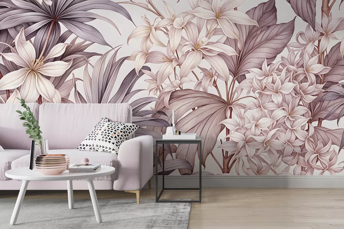 Τοιχογραφίες Ένα τροπικό floral print με μεγάλα λευκά και ανοιχτό ροζ λουλούδια, φύλλα μπορντό και ουδέτερο φόντο Nr. w08318v1