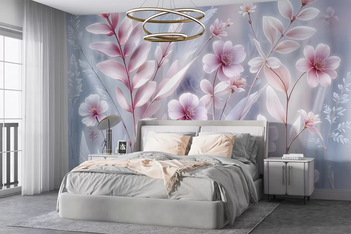 Τοιχογραφίες Λεπτά ροζ λουλούδια και ανθοδέσμες με απαλά πέταλα και φύλλα σε ανοιχτό γκρι αφηρημένο φόντο Nr. w08323