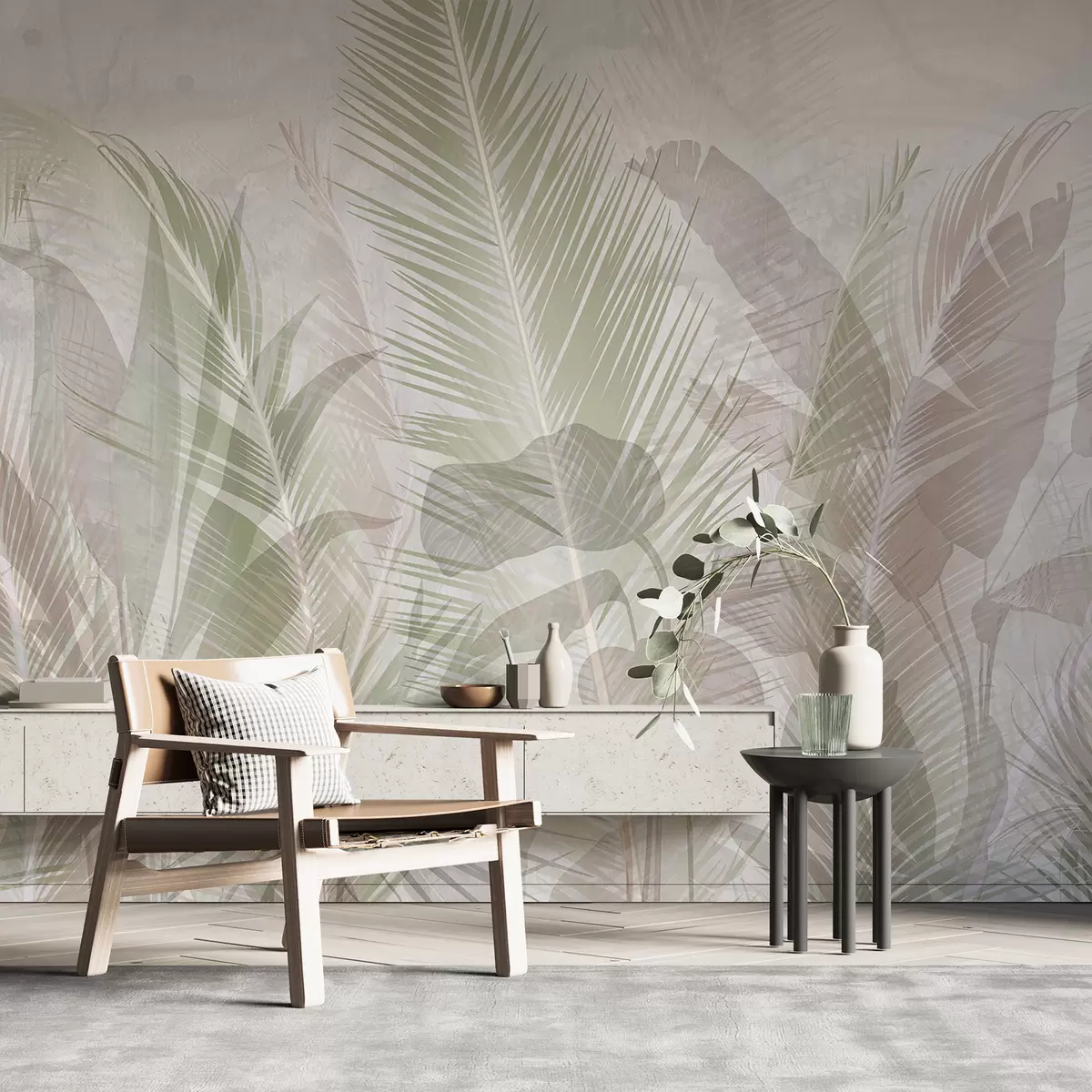 Τοιχογραφίες Τροπικά φύλλα φοίνικα σε απαλά παστέλ χρώματα, με θολό και μουντό φόντο με υφή Nr. w08326