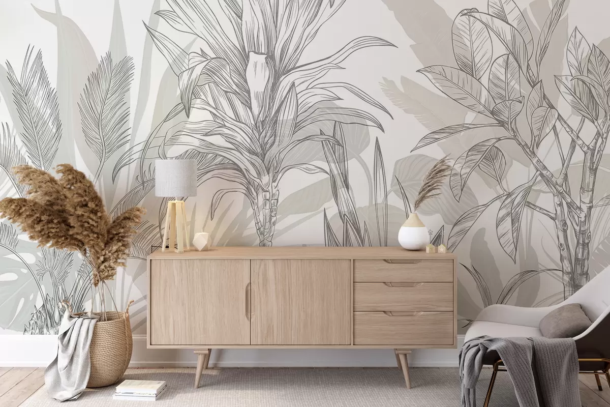 Τοιχογραφίες Ένα τροπικό γραφικό φυτών με μεγάλα, πλούσια φύλλα και λουλούδια σε αποχρώσεις του γκρι και του λευκού με πράσινες σιλουέτες λουλουδιών Nr. w08327