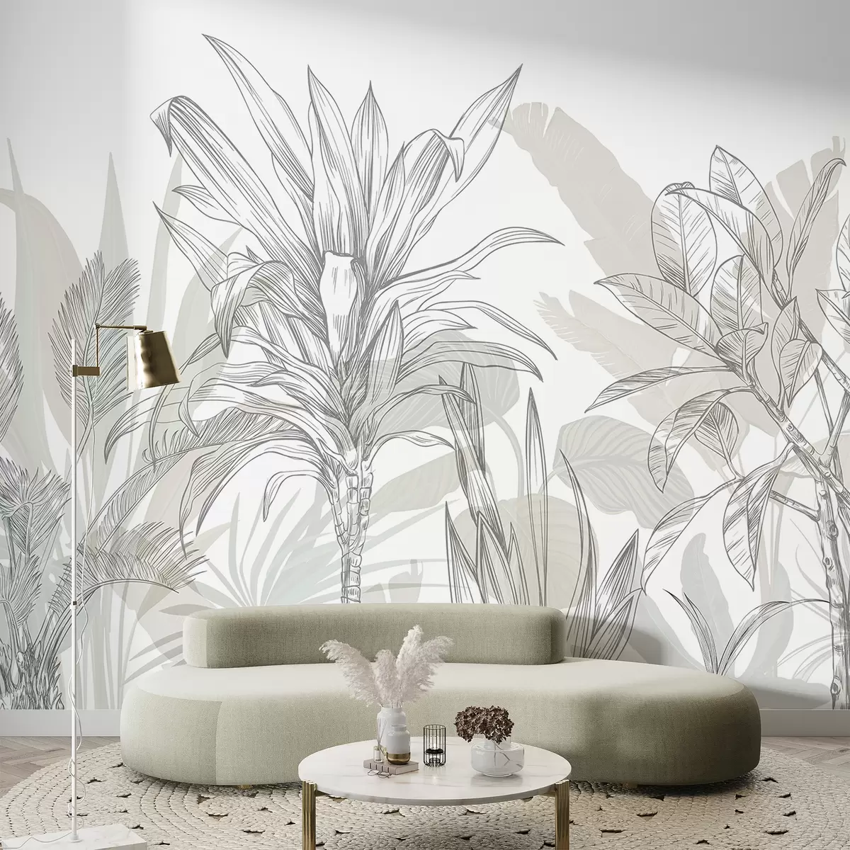 Τοιχογραφίες Ένα τροπικό γραφικό φυτών με μεγάλα, πλούσια φύλλα και λουλούδια σε αποχρώσεις του γκρι και του λευκού με πράσινες σιλουέτες λουλουδιών Nr. w08327