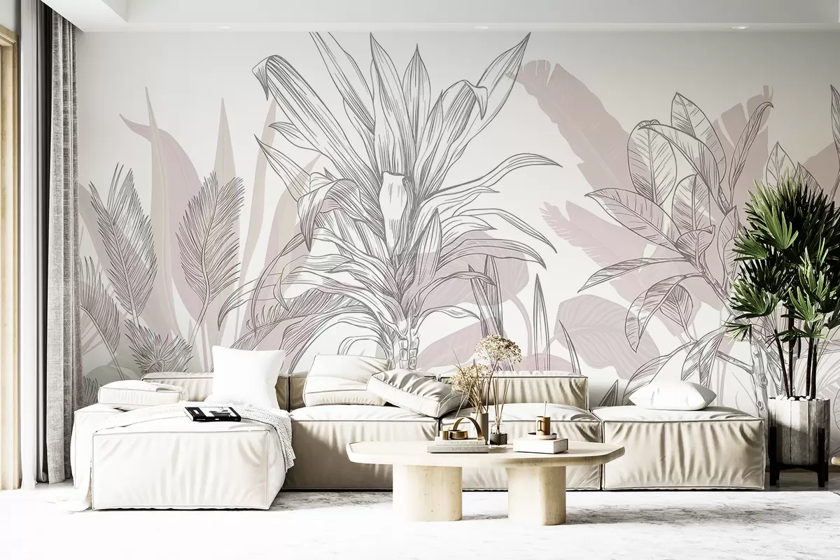 Τοιχογραφίες Ένα τροπικό γραφικό φυτών με μεγάλα, πλούσια φύλλα και λουλούδια σε αποχρώσεις του γκρι και του λευκού με λουλουδάτες ροζ σιλουέτες Nr. w08327v1