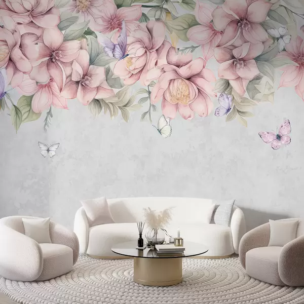 Τοιχογραφίες Απαλά ροζ και λευκά λουλουδάκια με λεπτά λουλούδια και φύλλα σε γκρι φόντο με υφή Nr. w08331