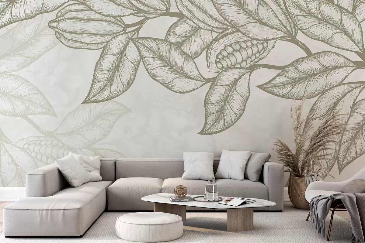 Τοιχογραφίες Λεπτομερές γραμμικό σχέδιο φύλλων και φυλλωμάτων κακάο σε φυσική, οργανική εκτύπωση Nr. w08334