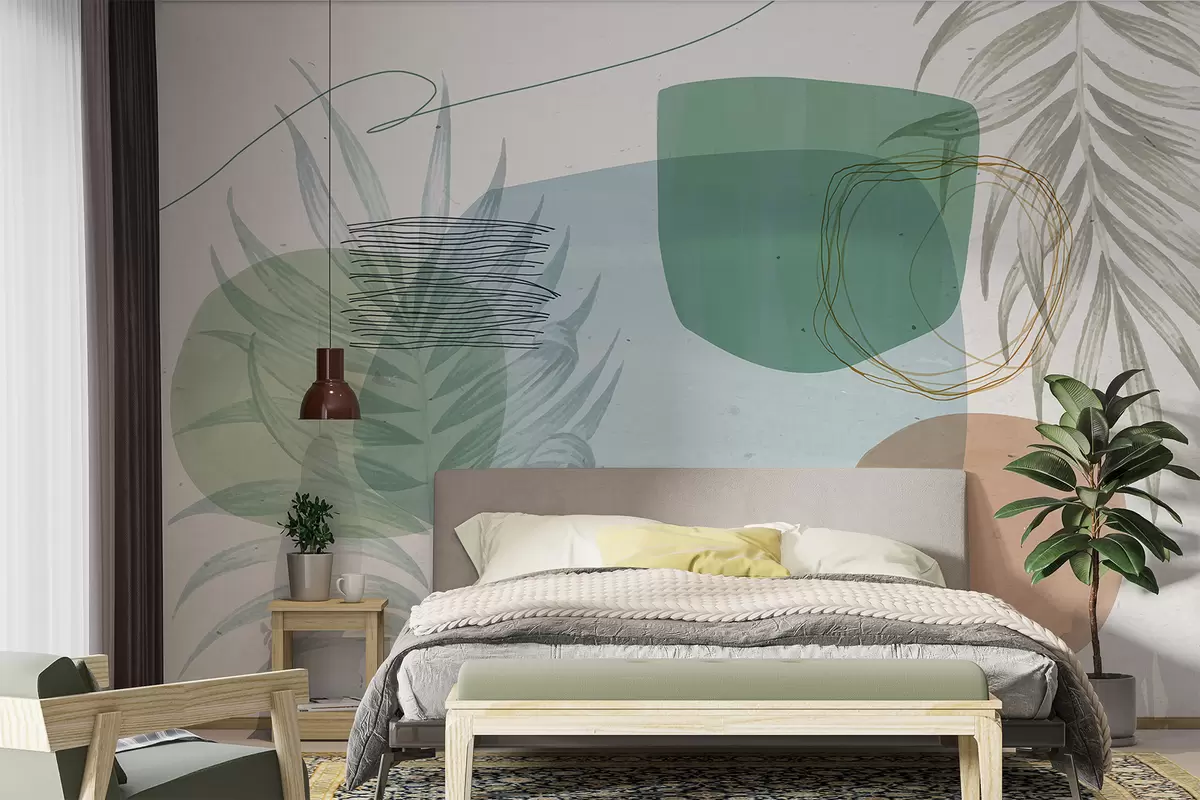 Τοιχογραφίες Αφηρημένη σύνθεση με οργανικά σχήματα και τροπικά φύλλα, σε απαλά παστέλ χρώματα Nr. w08335