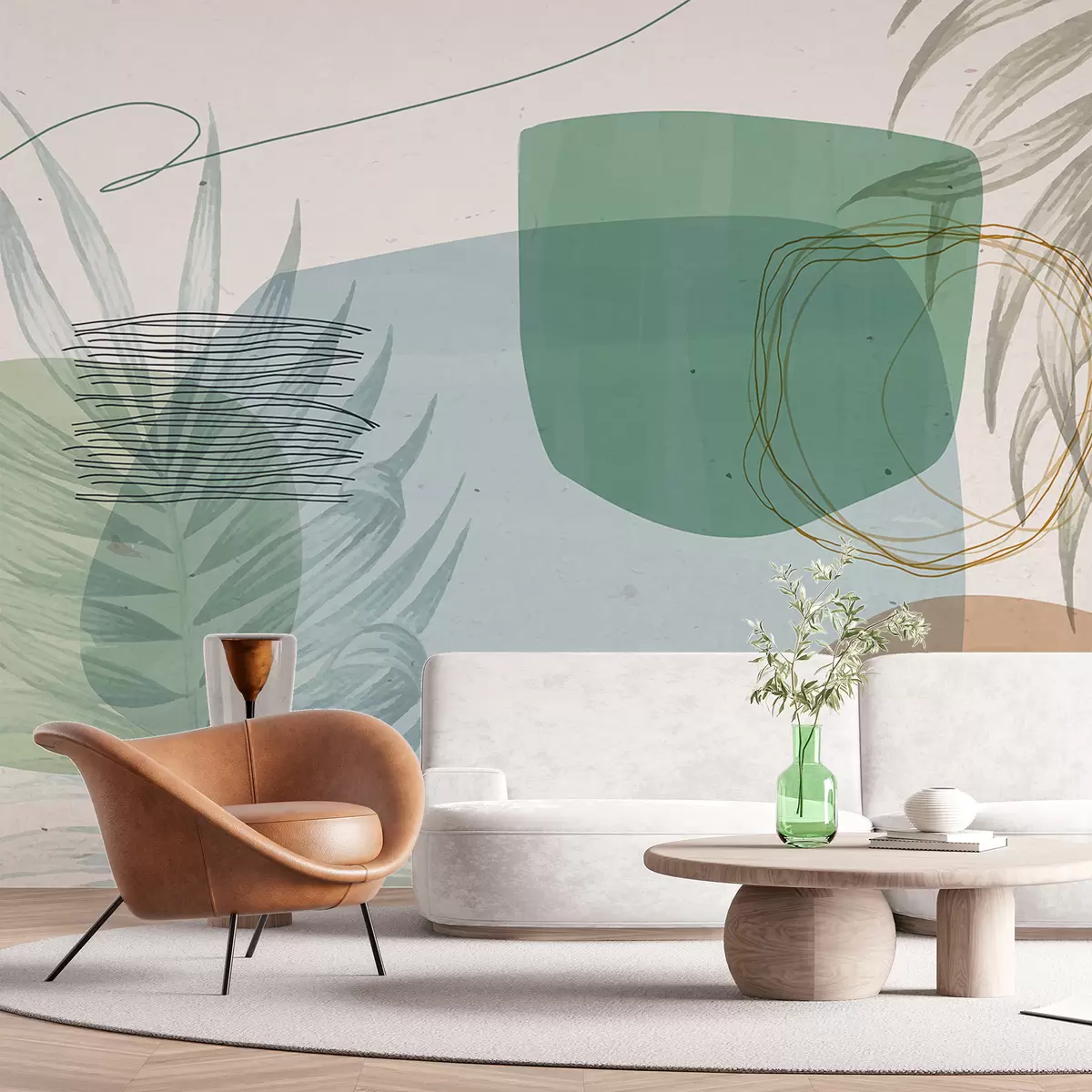 Τοιχογραφίες Αφηρημένη σύνθεση με οργανικά σχήματα και τροπικά φύλλα, σε απαλά παστέλ χρώματα Nr. w08335