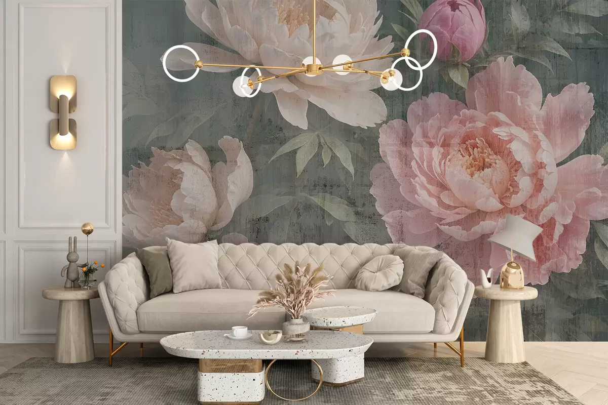 Τοιχογραφίες Μια κοντινή άποψη πολλών μεγάλων, υφή vintage πλούσια ροζ και λευκά λουλούδια παιώνιας σε σκούρο φόντο Nr. w08336
