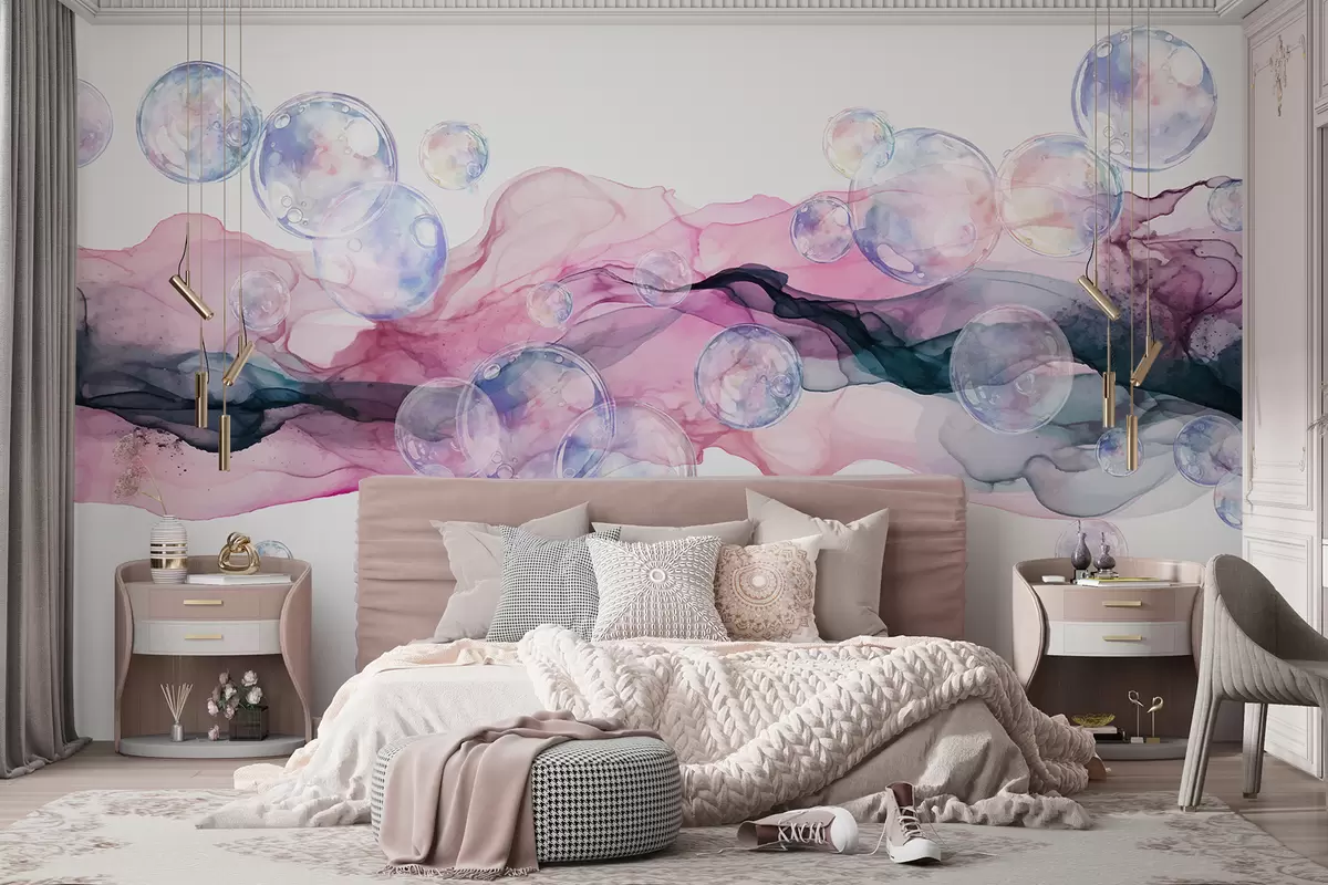 Τοιχογραφίες Πολύχρωμα αφηρημένα ρευστά σχήματα με φυσαλίδες, στροβιλισμούς ροζ, μπλε και μοβ αποχρώσεων σε λευκό φόντο Nr. w08337