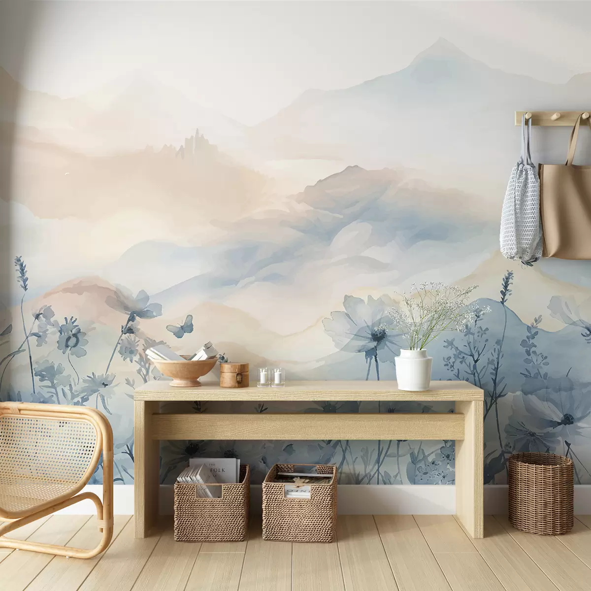 Τοιχογραφίες Ένα γαλήνιο τοπίο με μια ομιχλώδη οροσειρά στο φόντο, που περιβάλλεται από ένα χωράφι με λεπτεπίλεπτα μπλε λουλούδια Nr. w08339