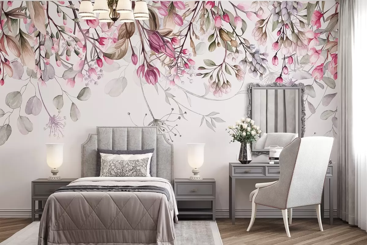 Τοιχογραφίες Λεπτά ροζ και λευκά κλαδιά λουλουδιών με φύλλα και πέταλα, σε παστέλ γκρι φόντο Nr. w08347