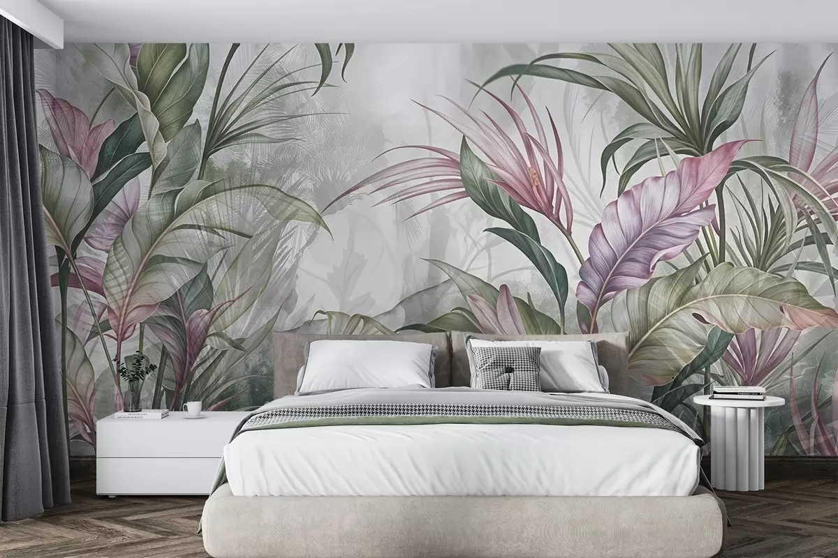 Τοιχογραφίες Τροπική ζούγκλα με μεγάλα πράσινα φύλλα και ροζ λουλούδια πρωτεΐνης με θολή υφή φόντου Nr. w08375