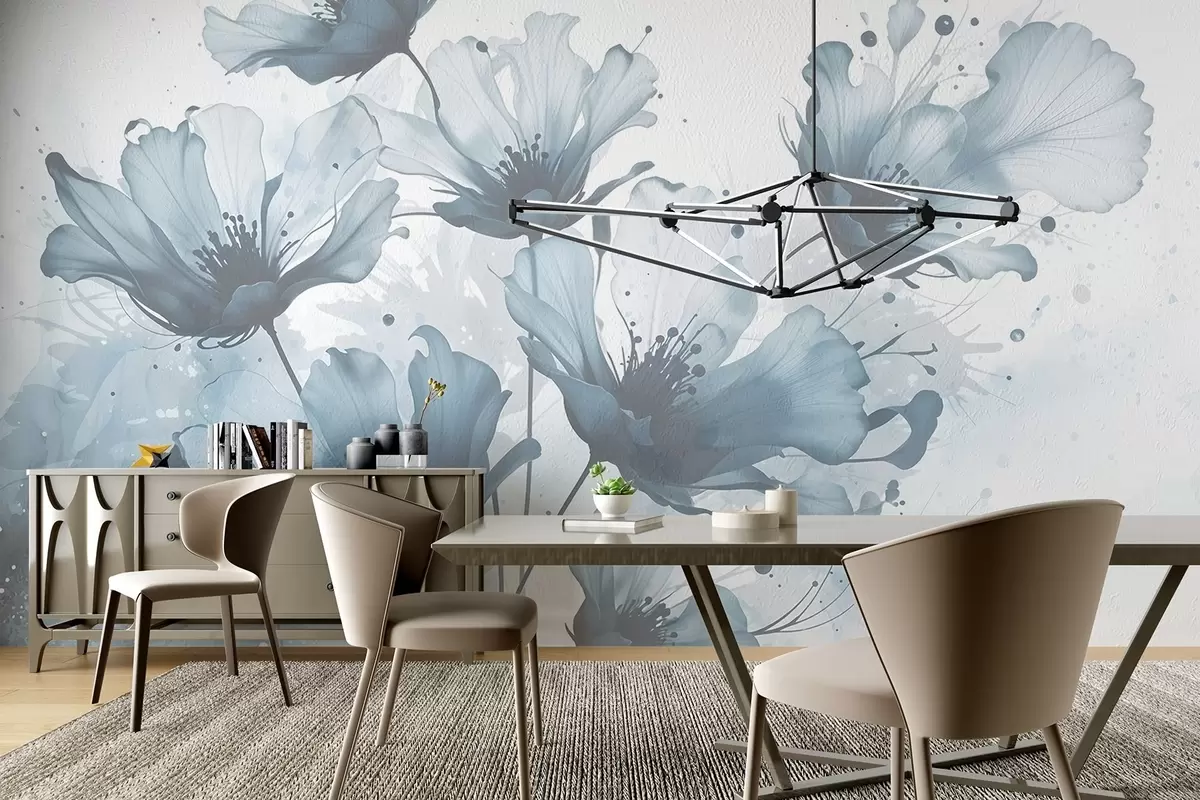 Τοιχογραφίες Λεπτά μπλε λουλούδια με μαλακά, θολά πέταλα και πιτσιλιές ακουαρέλας σε ανοιχτό φόντο Nr. w08376