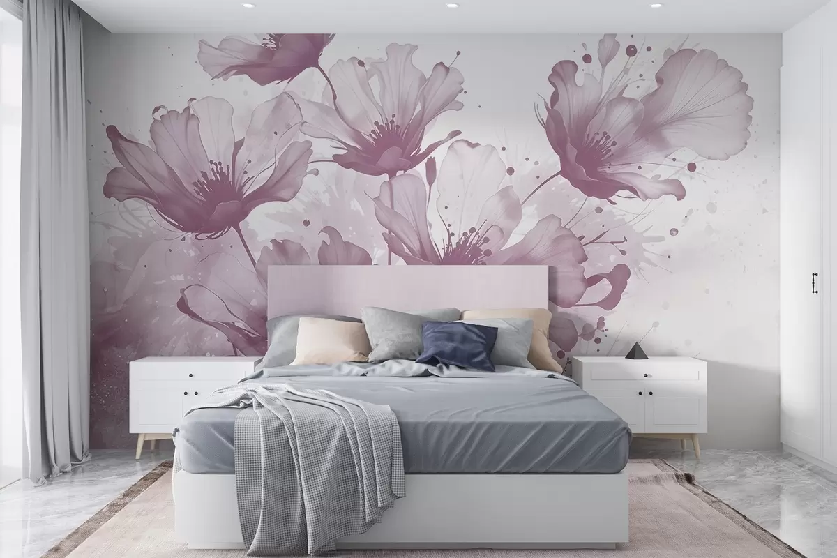 Τοιχογραφίες Ντελικάτα ροζ λουλούδια με απαλά, θολά πέταλα και νερομπογιές σε ανοιχτόχρωμο φόντο Nr. w08376v2