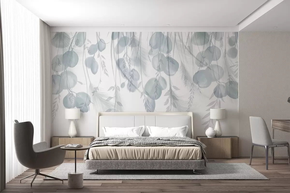 Τοιχογραφίες Λεπτά γκρίζα και παστέλ πράσινα φύλλα ευκαλύπτου που πέφτουν, δημιουργώντας μια γαλήνια και ηρεμιστική ατμόσφαιρα Nr. w08380