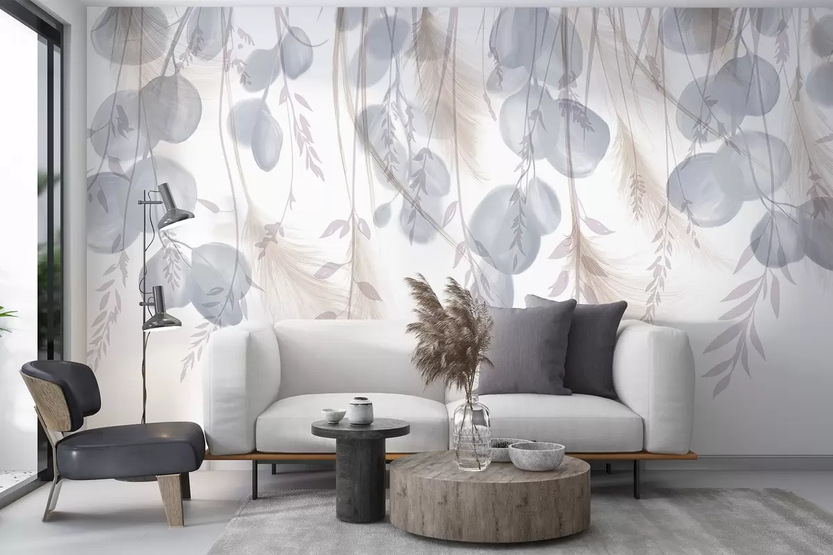 Τοιχογραφίες Λεπτά μπλε και παστέλ μπεζ φύλλα ευκαλύπτου που πέφτουν, δημιουργώντας μια γαλήνια και ηρεμιστική ατμόσφαιρα Nr. w08380v1