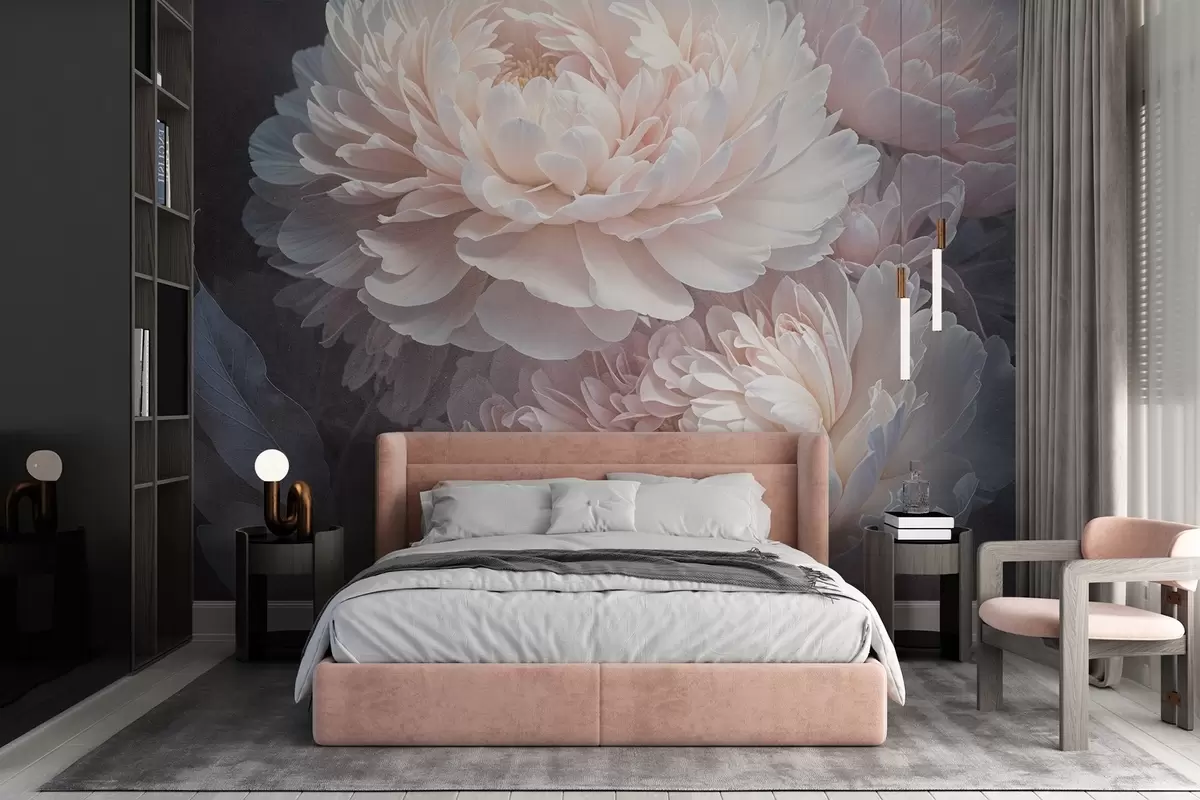 Τοιχογραφίες Κοντινό πλάνο δύο μεγάλων, ντελικάτων ροζ παιώνιων με μαλακά, χνουδωτά πέταλα και φύλλα σε θολό φόντο Nr. w08382