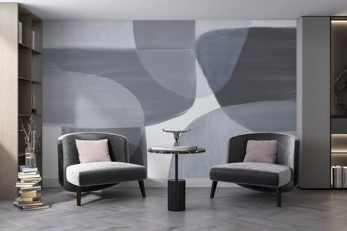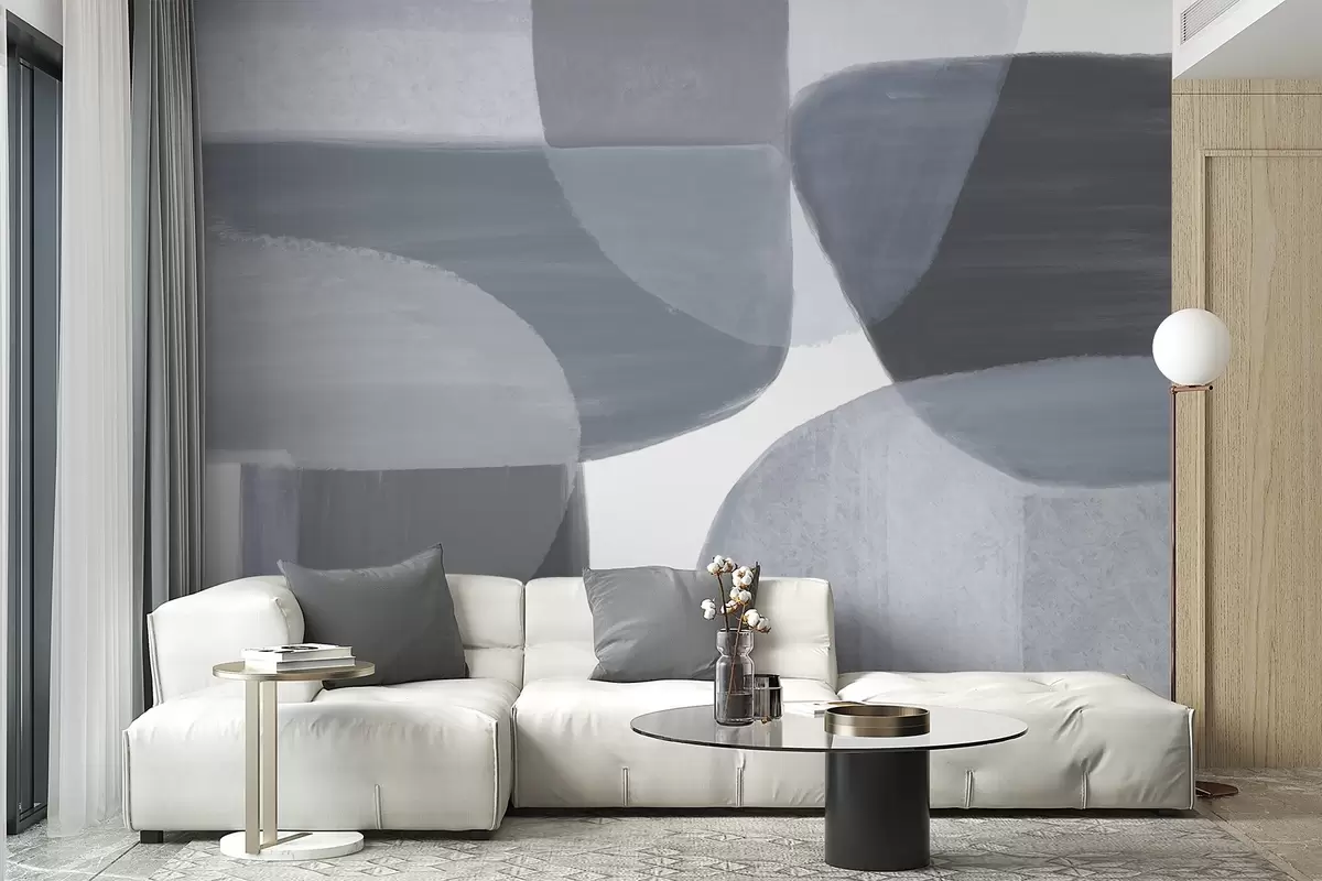 Τοιχογραφίες Μονόχρωμη αφηρημένη εκτύπωση με επικαλυπτόμενα μινιμαλιστικά σχήματα και μορφές σε αποχρώσεις του γκρι και του μπλε Nr. w08410
