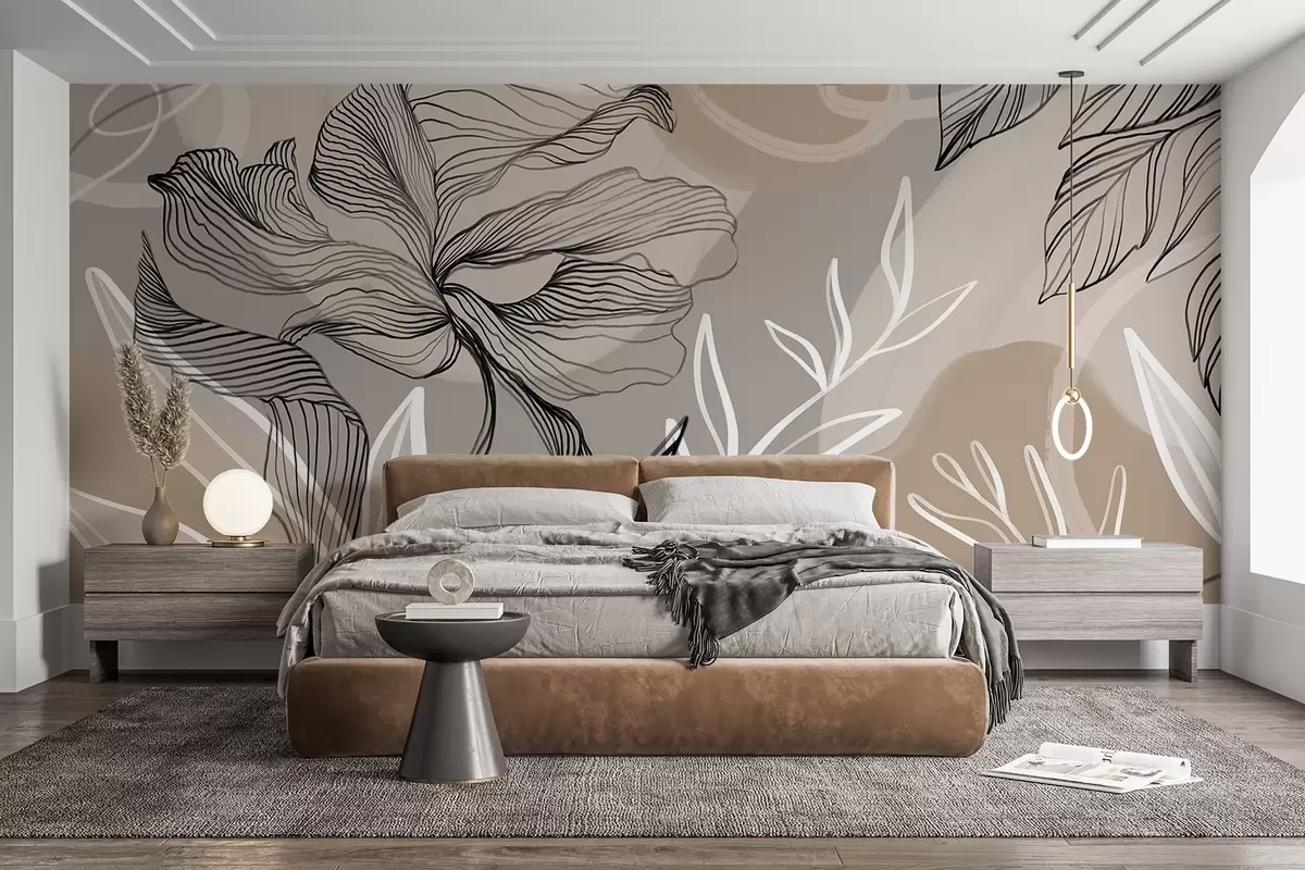 Τοιχογραφίες Κομψό floral print με μεγάλα αφηρημένα λουλούδια και φύλλα σε αποχρώσεις του γκρι και του μπεζ σε ανοιχτό φόντο Nr. w08413