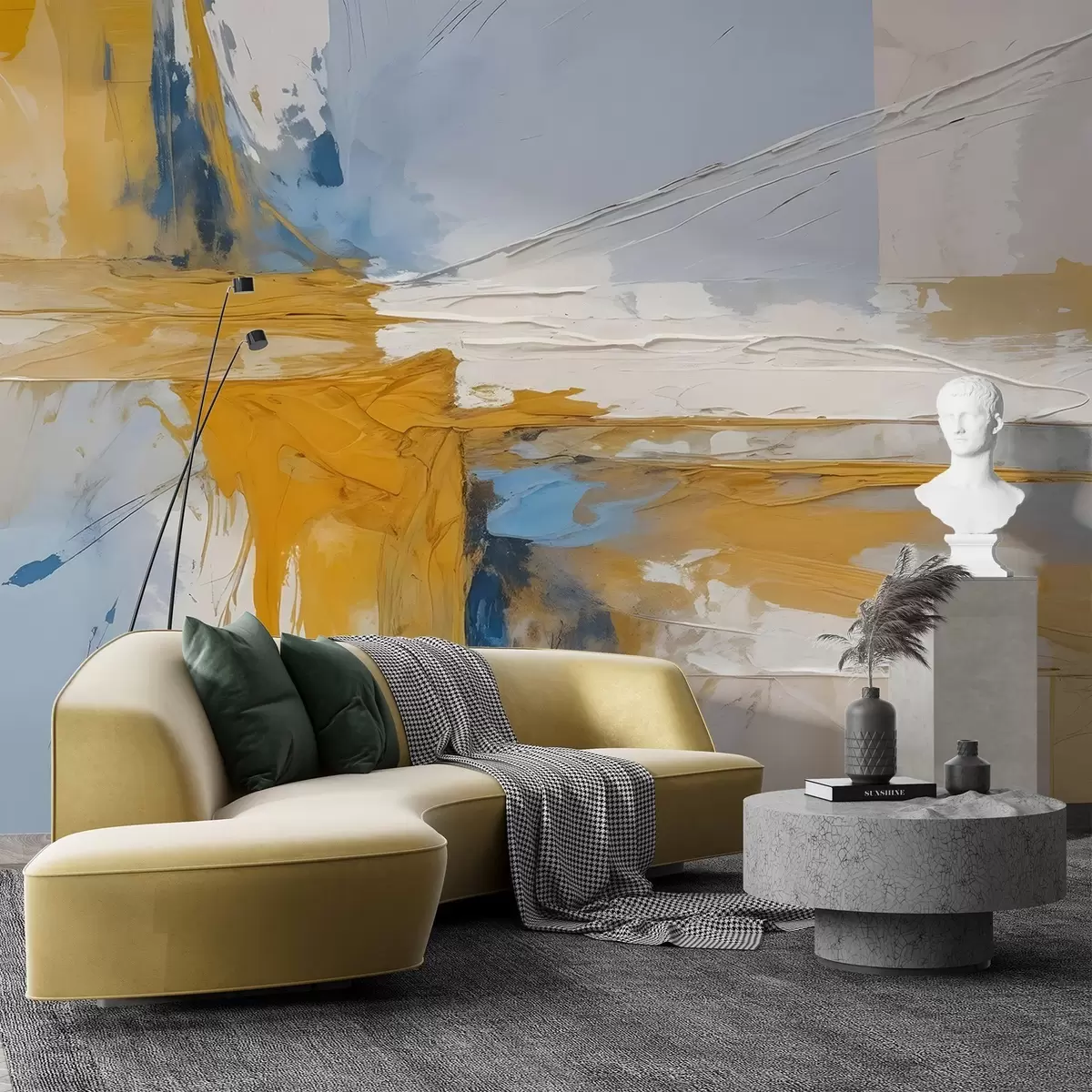 Τοιχογραφίες Μινιμαλιστική αφηρημένη σύνθεση τέχνης με έντονες πινελιές κίτρινου, μπλε και λευκού χρώματος Nr. w08414